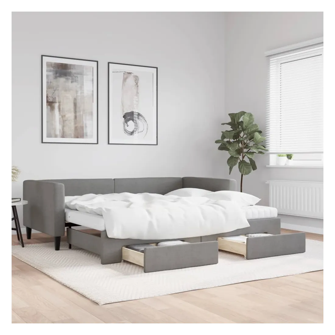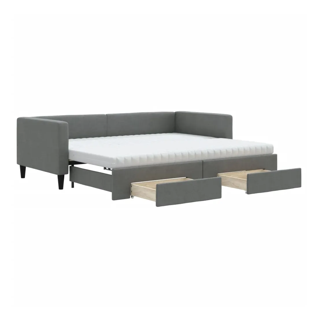 Ce lit de repos 2 en 1 avec lit gigogne, servant à la fois de canapé et de lit, constitue un supplément pratique et accrocheur à votre salon ou chambre à coucher. Lit de repos polyvalent : le canapé-lit fonctionne comme un canapé pendant la journée et se transforme facilement en lit double la nuit en retirant le lit gigogne, offrant une solution pratique pour accueillir des invités et maximiser l'espace. Grand espace de rangement : ce lit d'appoint dispose de deux tiroirs à roulettes qui offrent suffisamment d'espace pour ranger vos vêtements, chaussettes, jouets, coussins, etc. Matelas en mousse confortable : ce lit est fourni avec deux matelas en mousse pour un soutien maximal et un confort optimal. Tissu durable et construction solide : ce canapé-lit a une structure robuste en bois et en métal et est recouvert d'un tissu durable et confortable.