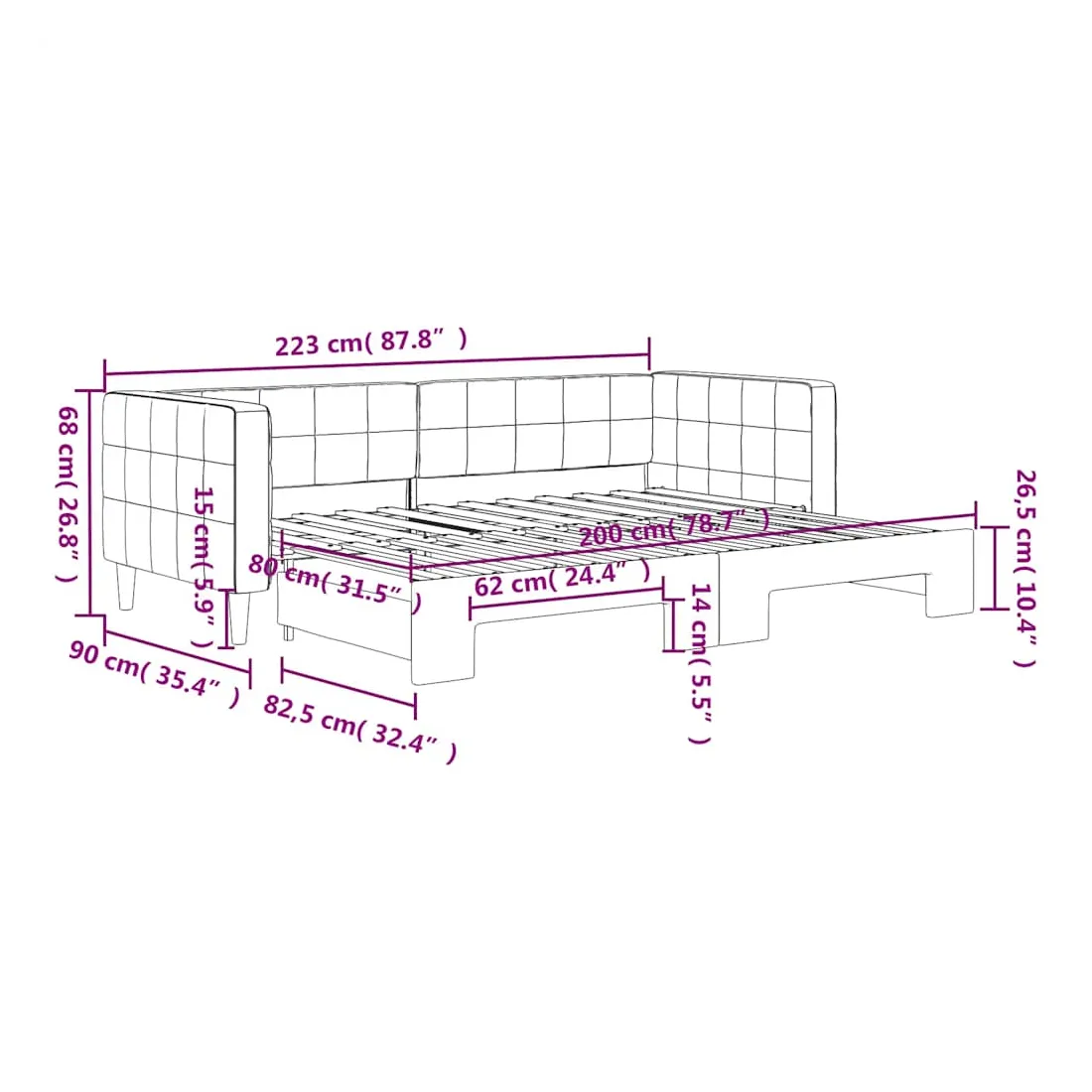 - Dimensions (non déployé) : 223 x 90 x 68 cm (L x l x H)