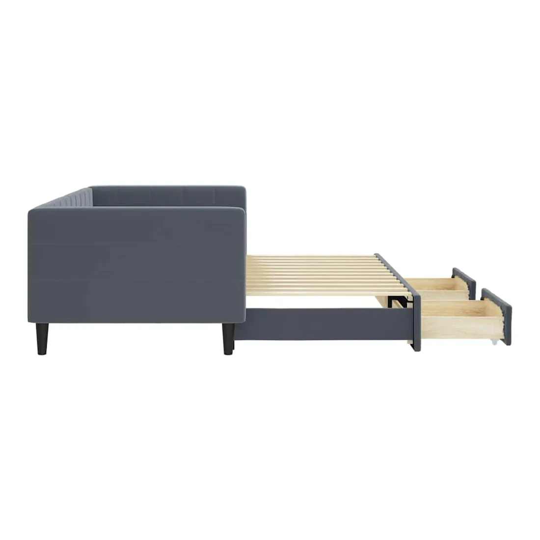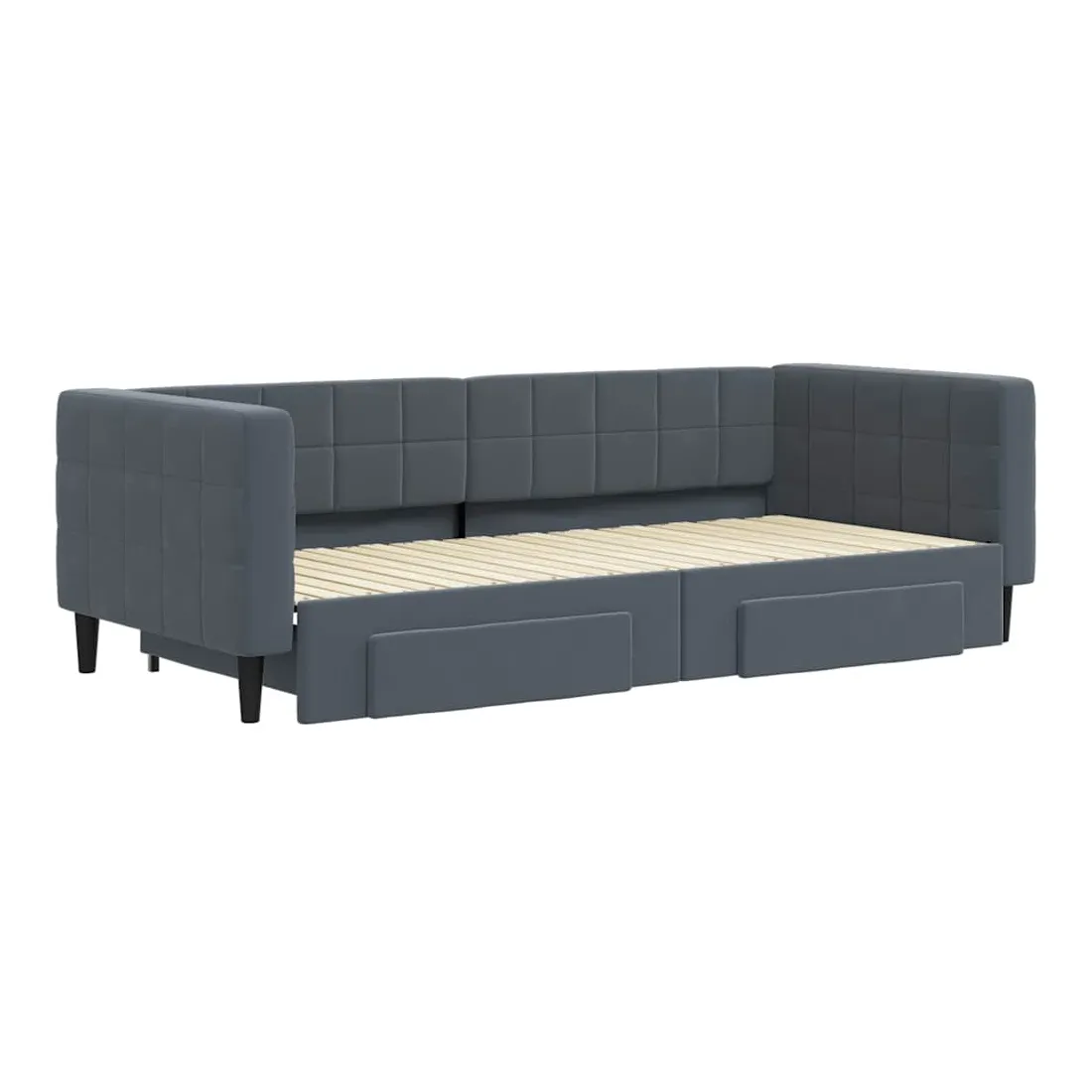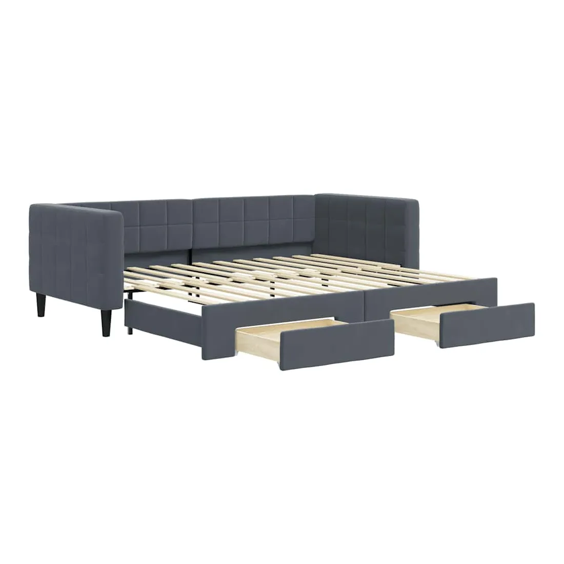 Ce lit de repos 2 en 1 avec lit gigogne, servant à la fois de canapé et de lit, constitue un supplément pratique et accrocheur à votre salon ou chambre à coucher. Lit de repos polyvalent : le canapé-lit fonctionne comme un canapé pendant la journée et se transforme facilement en lit double la nuit en retirant le lit gigogne, offrant une solution pratique pour accueillir des invités et maximiser l'espace.Grand espace de rangement : ce lit d'appoint dispose de deux tiroirs à roulettes qui offrent suffisamment d'espace pour ranger vos vêtements, chaussettes, jouets, coussins, etc.Velours doux et construction solide : ce canapé-lit a un cadre robuste en bois et en métal et est recouvert de velours doux et confortable.Design moderne : le canapé-lit a un design moderne qui présente des lignes épurées, un aspect minimaliste, ainsi que de la lumière naturelle, et ajoutera un style moderne à votre intérieur ! Bon à savoir :Les matelas ne sont pas inclus avec ce lit. Nous proposons une sélection variée de matelas. Vous pouvez consulter notre boutique pour trouver les matelas assortis.