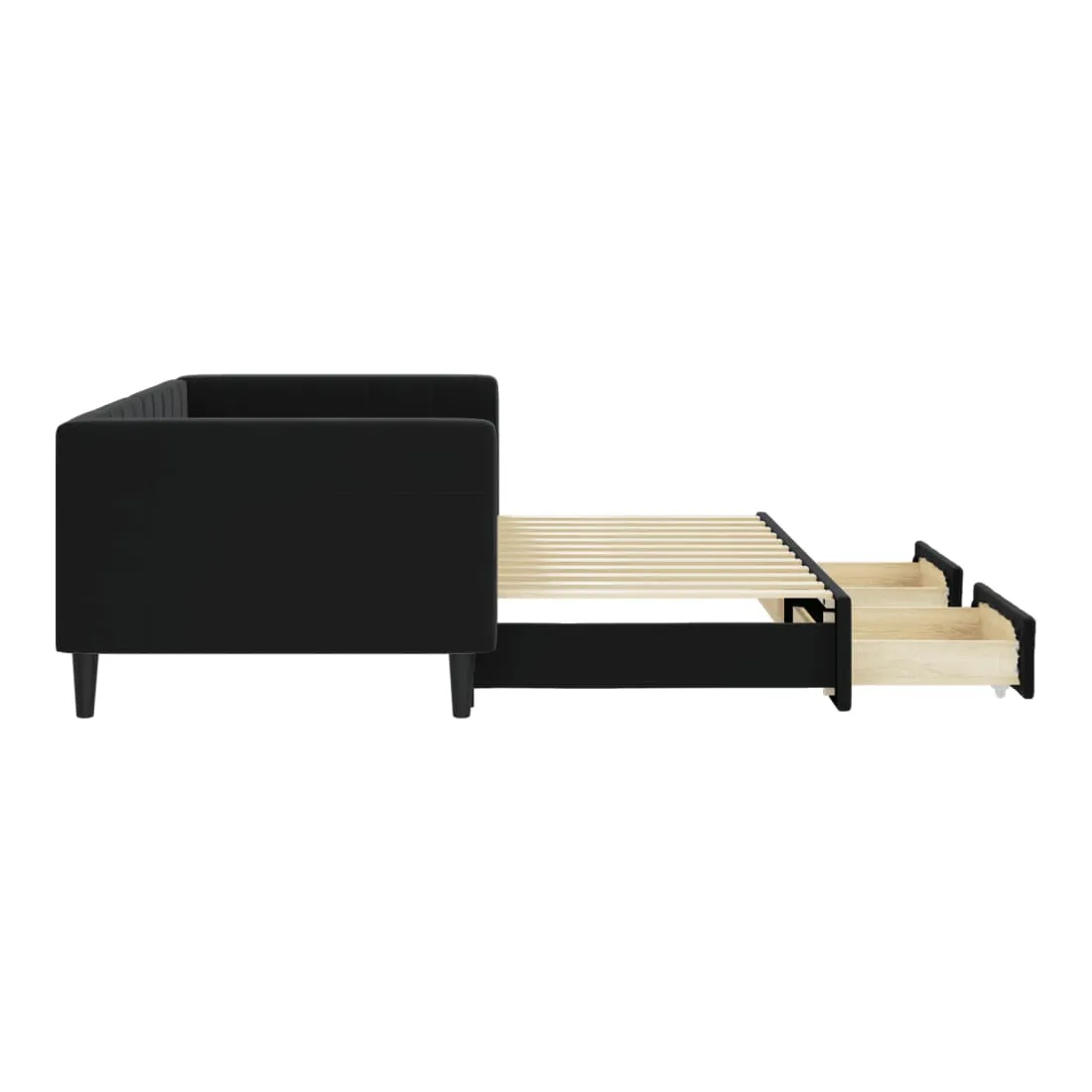 Ce lit de repos 2 en 1 avec lit gigogne, servant à la fois de canapé et de lit, constitue un supplément pratique et accrocheur à votre salon ou chambre à coucher. Lit de repos polyvalent : le canapé-lit fonctionne comme un canapé pendant la journée et se transforme facilement en lit double la nuit en retirant le lit gigogne, offrant une solution pratique pour accueillir des invités et maximiser l'espace.Grand espace de rangement : ce lit d'appoint dispose de deux tiroirs à roulettes qui offrent suffisamment d'espace pour ranger vos vêtements, chaussettes, jouets, coussins, etc.Velours doux et construction solide : ce canapé-lit a un cadre robuste en bois et en métal et est recouvert de velours doux et confortable.Design moderne : le canapé-lit a un design moderne qui présente des lignes épurées, un aspect minimaliste, ainsi que de la lumière naturelle, et ajoutera un style moderne à votre intérieur ! Bon à savoir :Les matelas ne sont pas inclus avec ce lit. Nous proposons une sélection variée de matelas. Vous pouvez consulter notre boutique pour trouver les matelas assortis.