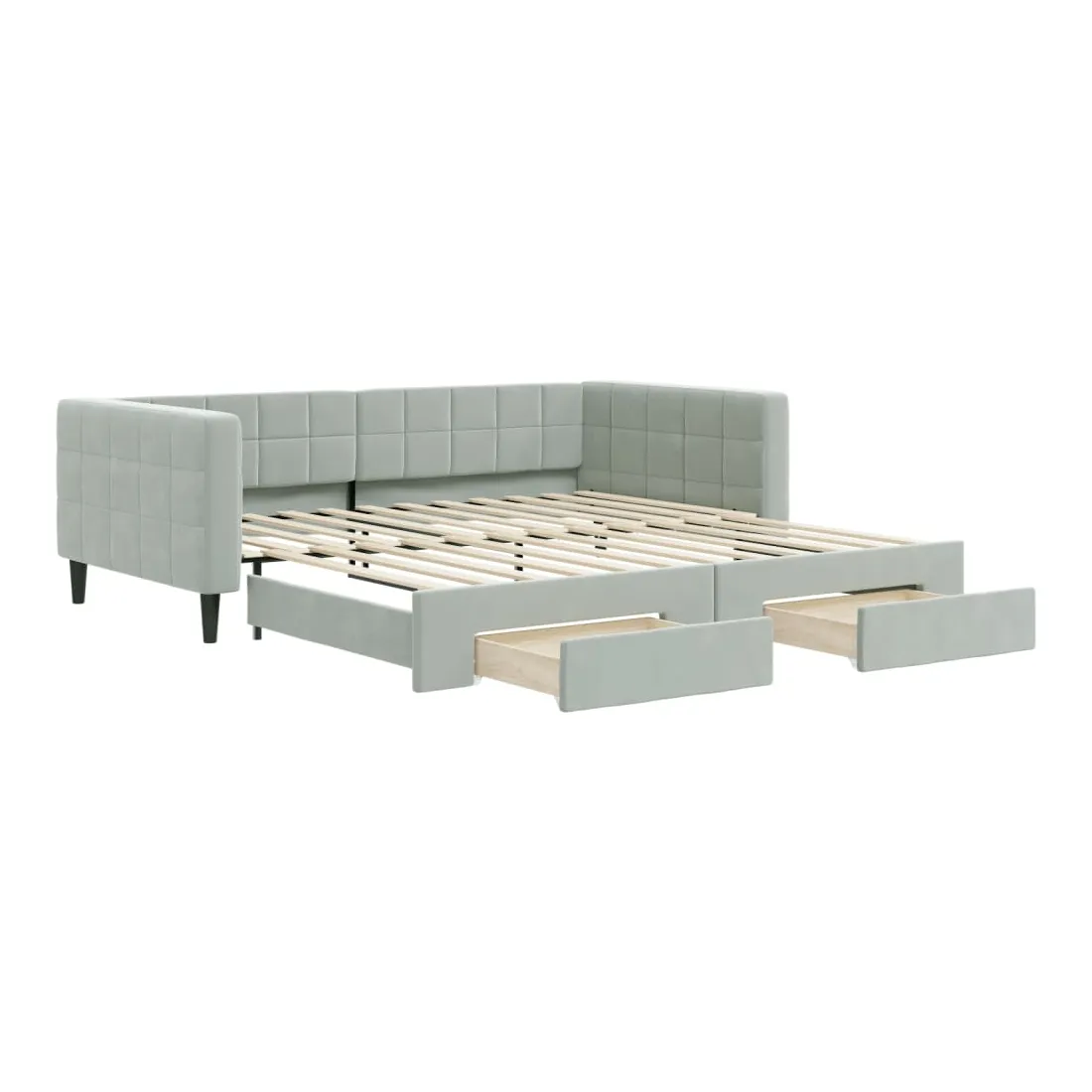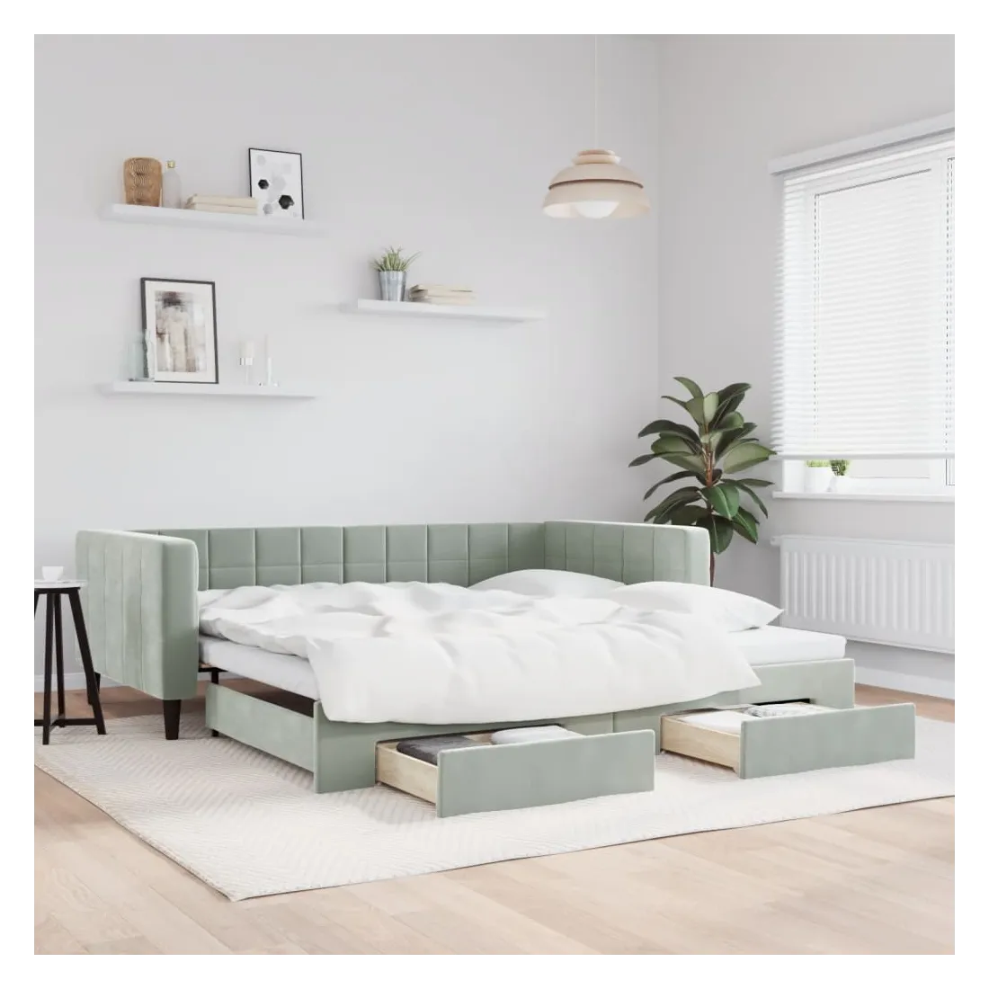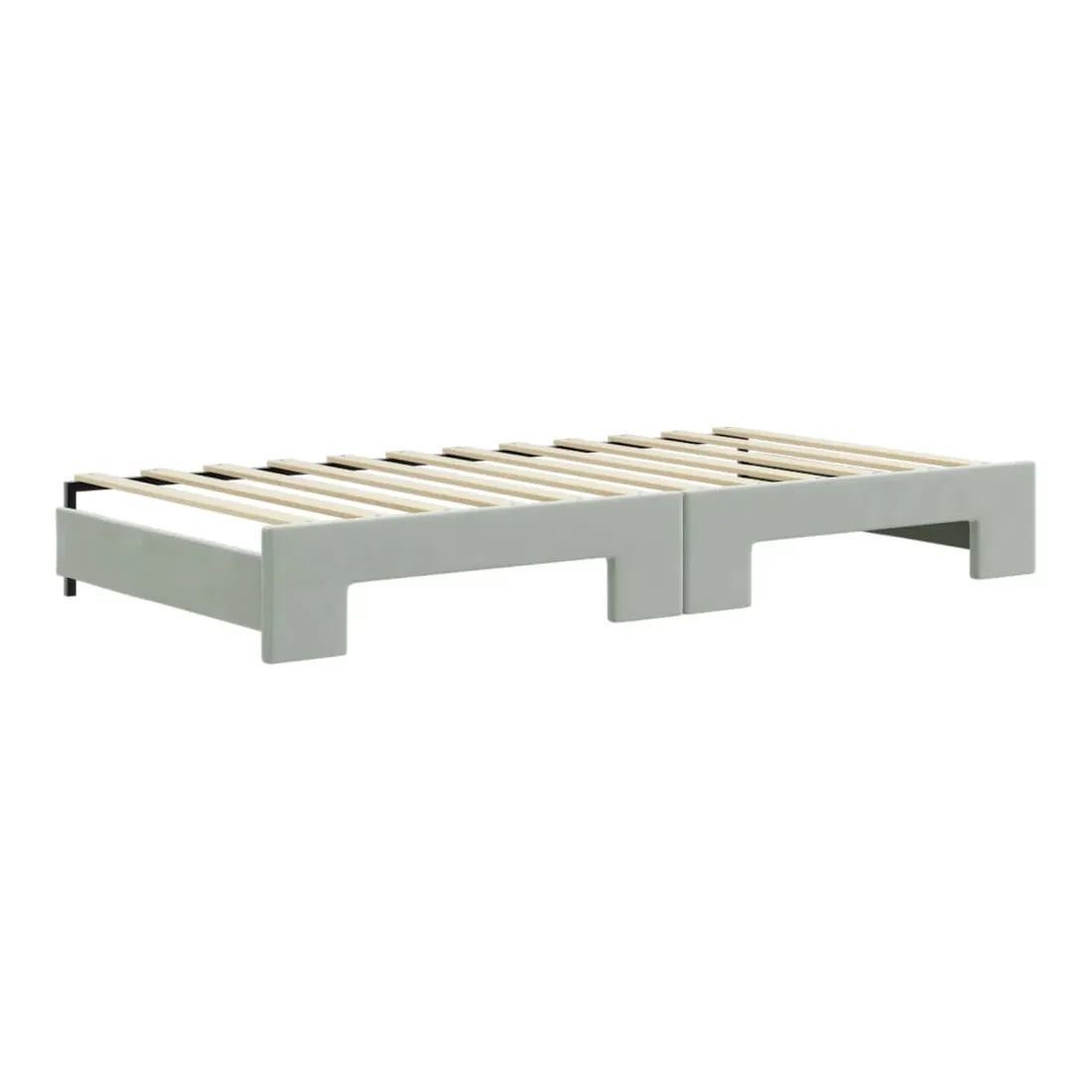 Ce lit de repos 2 en 1 avec lit gigogne, servant à la fois de canapé et de lit, constitue un supplément pratique et accrocheur à votre salon ou chambre à coucher. Lit de repos polyvalent : le canapé-lit fonctionne comme un canapé pendant la journée et se transforme facilement en lit double la nuit en retirant le lit gigogne, offrant une solution pratique pour accueillir des invités et maximiser l'espace.Grand espace de rangement : ce lit d'appoint dispose de deux tiroirs à roulettes qui offrent suffisamment d'espace pour ranger vos vêtements, chaussettes, jouets, coussins, etc.Velours doux et construction solide : ce canapé-lit a un cadre robuste en bois et en métal et est recouvert de velours doux et confortable.Design moderne : le canapé-lit a un design moderne qui présente des lignes épurées, un aspect minimaliste, ainsi que de la lumière naturelle, et ajoutera un style moderne à votre intérieur ! Bon à savoir :Les matelas ne sont pas inclus avec ce lit. Nous proposons une sélection variée de matelas. Vous pouvez consulter notre boutique pour trouver les matelas assortis.