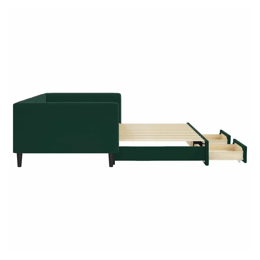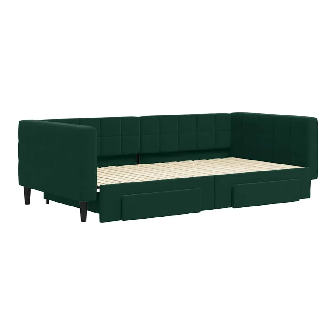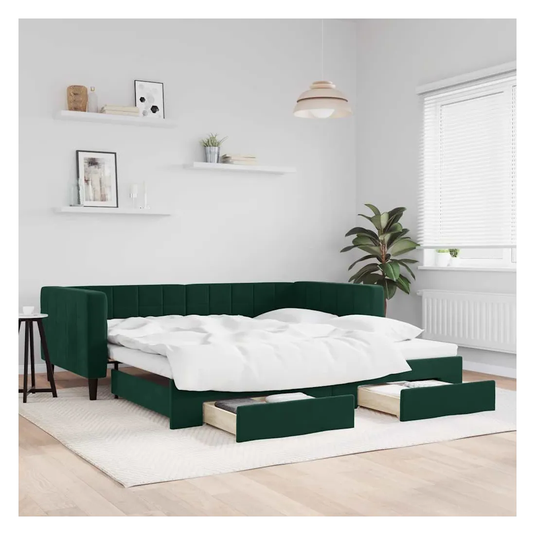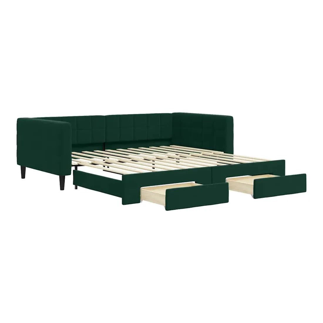 Ce lit de repos 2 en 1 avec lit gigogne, servant à la fois de canapé et de lit, constitue un supplément pratique et accrocheur à votre salon ou chambre à coucher. Lit de repos polyvalent : le canapé-lit fonctionne comme un canapé pendant la journée et se transforme facilement en lit double la nuit en retirant le lit gigogne, offrant une solution pratique pour accueillir des invités et maximiser l'espace.Grand espace de rangement : ce lit d'appoint dispose de deux tiroirs à roulettes qui offrent suffisamment d'espace pour ranger vos vêtements, chaussettes, jouets, coussins, etc.Velours doux et construction solide : ce canapé-lit a un cadre robuste en bois et en métal et est recouvert de velours doux et confortable.Design moderne : le canapé-lit a un design moderne qui présente des lignes épurées, un aspect minimaliste, ainsi que de la lumière naturelle, et ajoutera un style moderne à votre intérieur ! Bon à savoir :Les matelas ne sont pas inclus avec ce lit. Nous proposons une sélection variée de matelas. Vous pouvez consulter notre boutique pour trouver les matelas assortis.