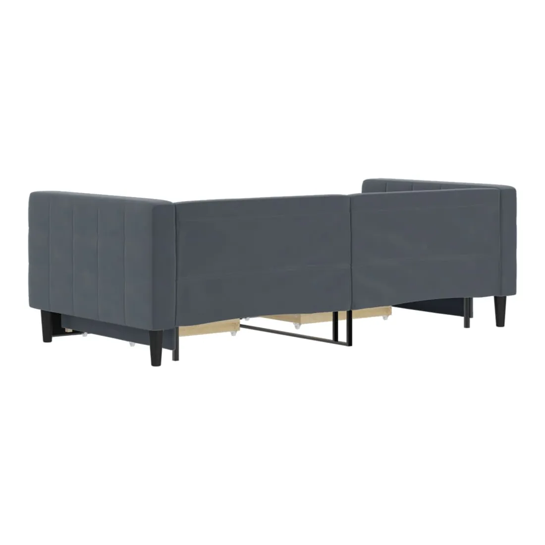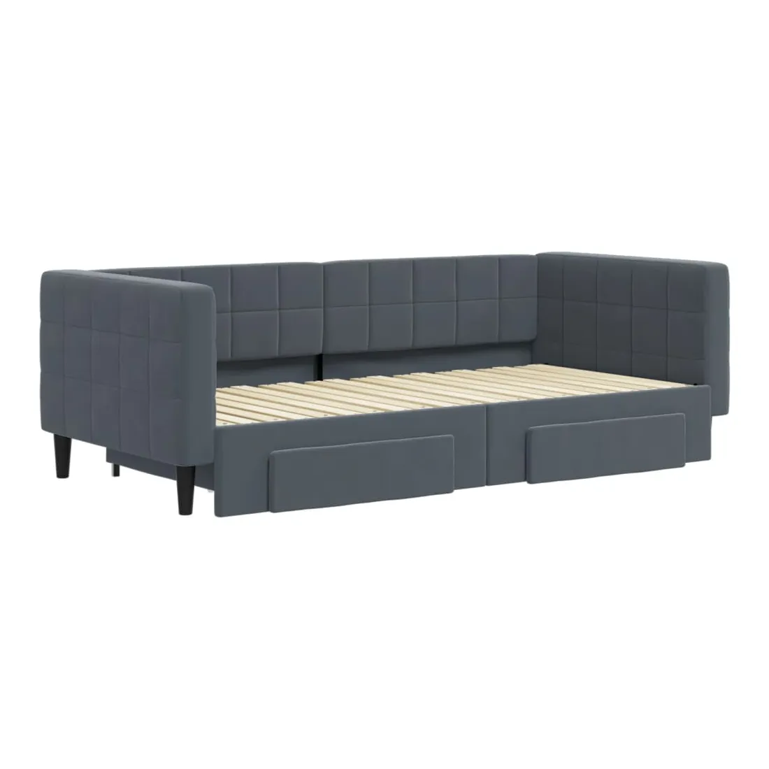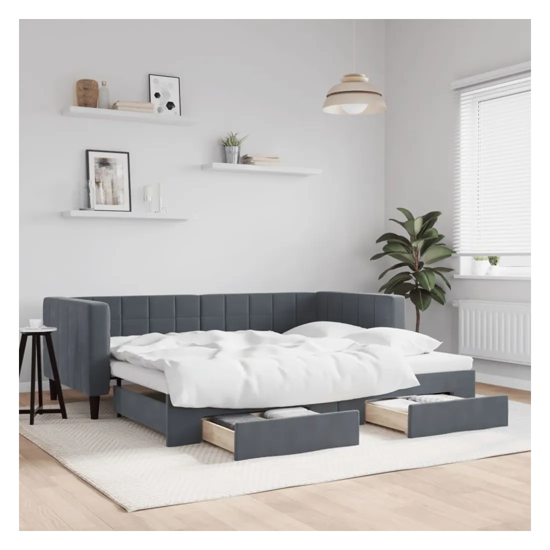 Ce lit de repos 2 en 1 avec lit gigogne, servant à la fois de canapé et de lit, constitue un supplément pratique et accrocheur à votre salon ou chambre à coucher. Lit de repos polyvalent : le canapé-lit fonctionne comme un canapé pendant la journée et se transforme facilement en lit double la nuit en retirant le lit gigogne, offrant une solution pratique pour accueillir des invités et maximiser l'espace.Grand espace de rangement : ce lit d'appoint dispose de deux tiroirs à roulettes qui offrent suffisamment d'espace pour ranger vos vêtements, chaussettes, jouets, coussins, etc.Velours doux et construction solide : ce canapé-lit a un cadre robuste en bois et en métal et est recouvert de velours doux et confortable.Design moderne : le canapé-lit a un design moderne qui présente des lignes épurées, un aspect minimaliste, ainsi que de la lumière naturelle, et ajoutera un style moderne à votre intérieur ! Bon à savoir :Les matelas ne sont pas inclus avec ce lit. Nous proposons une sélection variée de matelas. Vous pouvez consulter notre boutique pour trouver les matelas assortis.