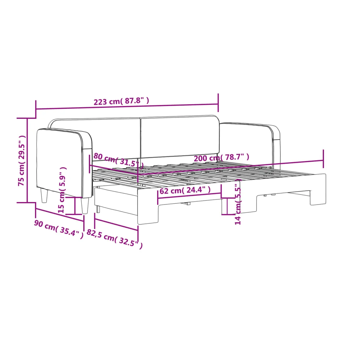 - Dimensions (non déployé) : 223 x 90 x 75 cm (L x l x H)