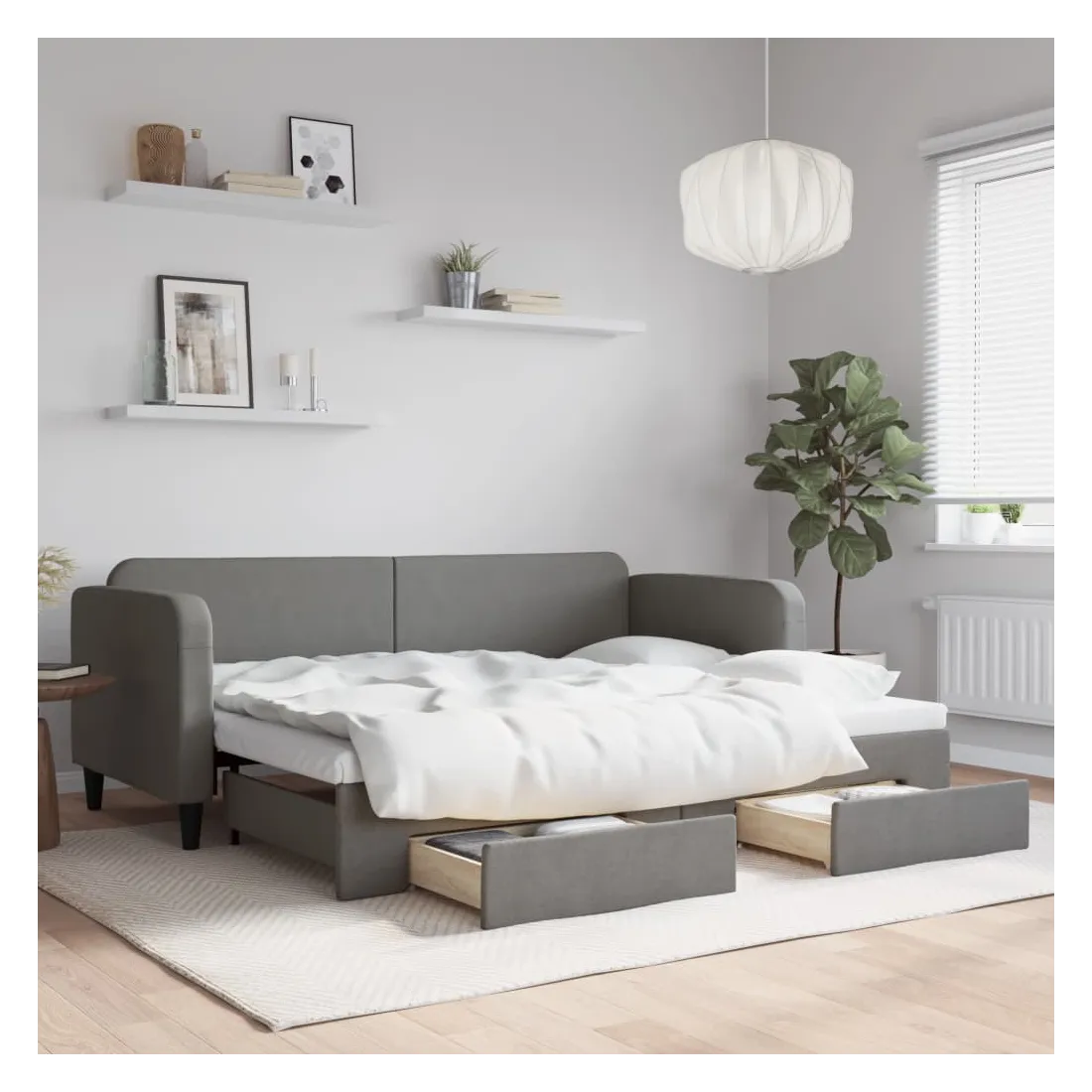 Ce lit de repos 2 en 1 avec lit gigogne, servant à la fois de canapé et de lit, constitue un supplément pratique et accrocheur à votre salon ou chambre à coucher. Lit de repos polyvalent : le canapé-lit fonctionne comme un canapé pendant la journée et se transforme facilement en lit double la nuit en retirant le lit gigogne, offrant une solution pratique pour accueillir des invités et maximiser l'espace.Grand espace de rangement : ce lit d'appoint dispose de deux tiroirs à roulettes qui offrent suffisamment d'espace pour ranger vos vêtements, chaussettes, jouets, coussins, etc.Tissu durable et construction solide : ce canapé-lit a une structure robuste en bois et en métal et est recouvert d'un tissu durable et confortable. Bon à savoir :Les matelas ne sont pas inclus avec ce lit de repos. Nous proposons une sélection variée de matelas. Vous pouvez consulter notre boutique pour les matelas assortis.
