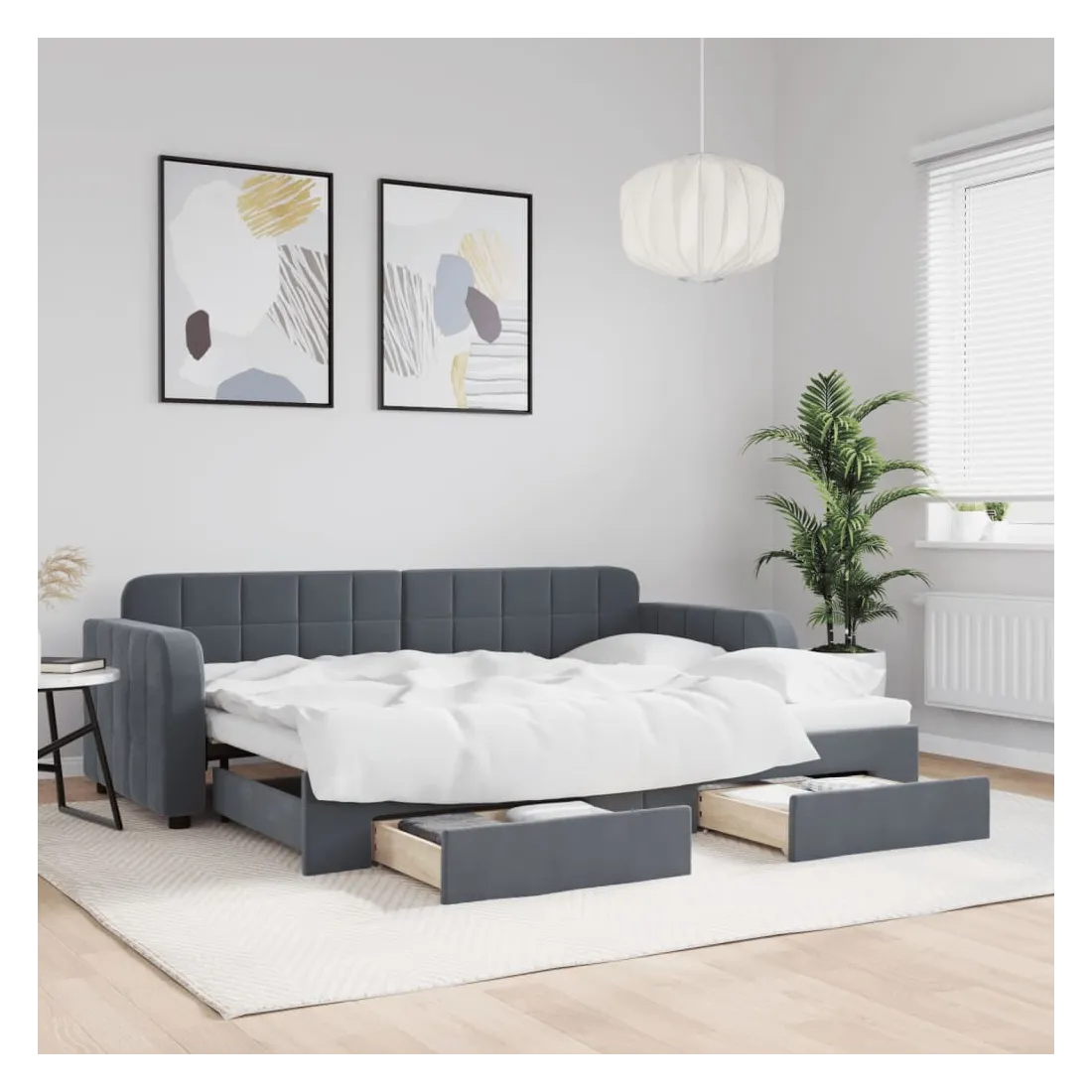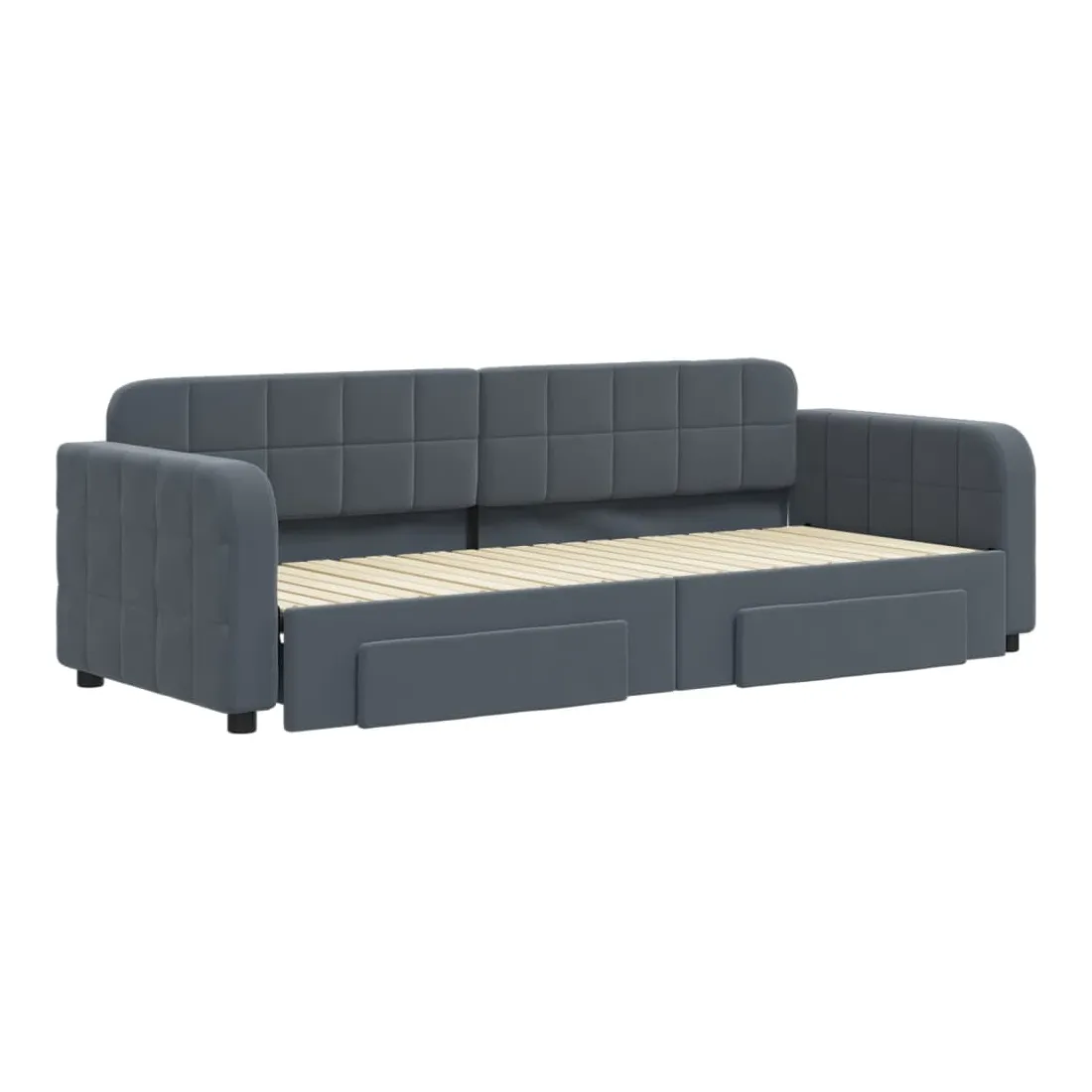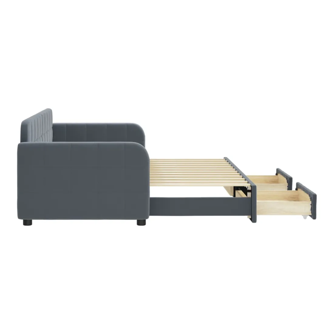 Ce lit de repos 2 en 1 avec lit gigogne, servant à la fois de canapé et de lit, constitue un supplément pratique et accrocheur à votre salon ou chambre à coucher. Lit de repos polyvalent : le canapé-lit fonctionne comme un canapé pendant la journée et se transforme facilement en lit double la nuit en retirant le lit gigogne, offrant une solution pratique pour accueillir des invités et maximiser l'espace. Grand espace de rangement : ce lit d'appoint dispose de deux tiroirs à roulettes qui offrent suffisamment d'espace pour ranger vos vêtements, chaussettes, jouets, coussins, etc.Velours doux et construction solide : ce canapé-lit a un cadre robuste en bois et en métal et est recouvert de velours doux et confortable. Bon à savoir :Les matelas ne sont pas inclus avec ce lit. Nous proposons une sélection variée de matelas. Vous pouvez consulter notre boutique pour trouver les matelas assortis.