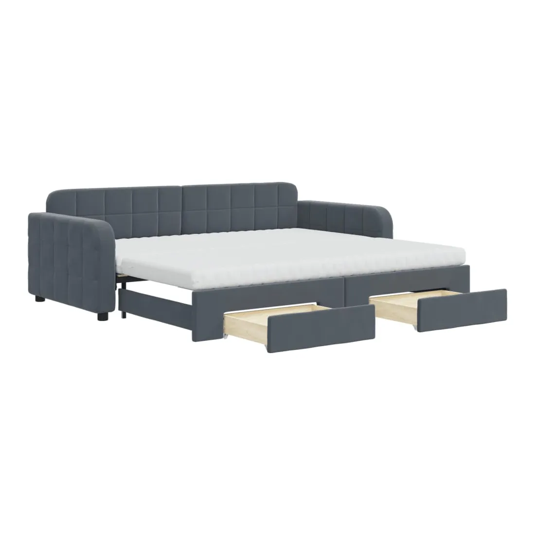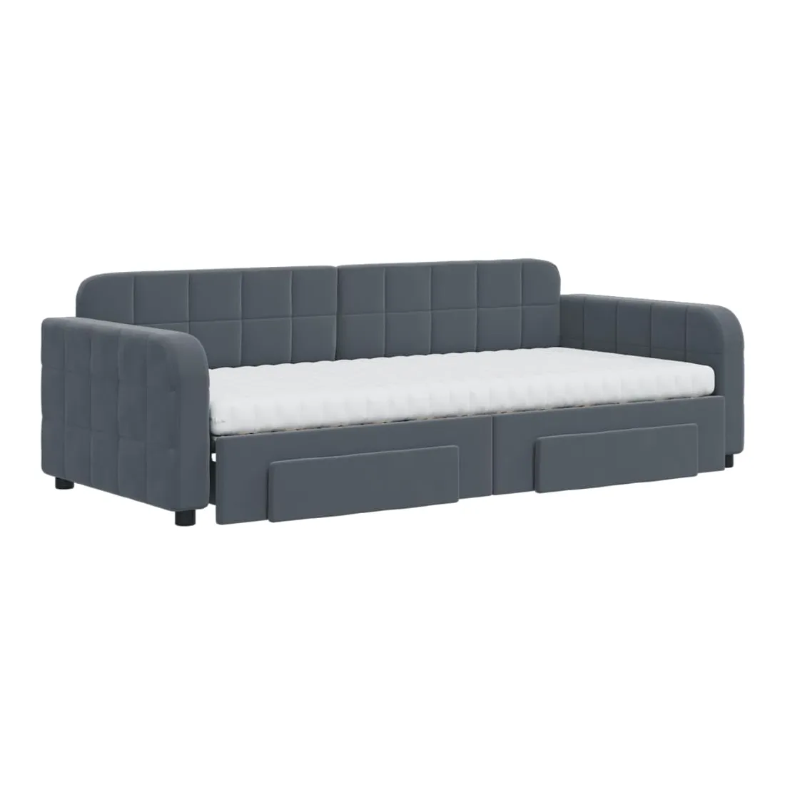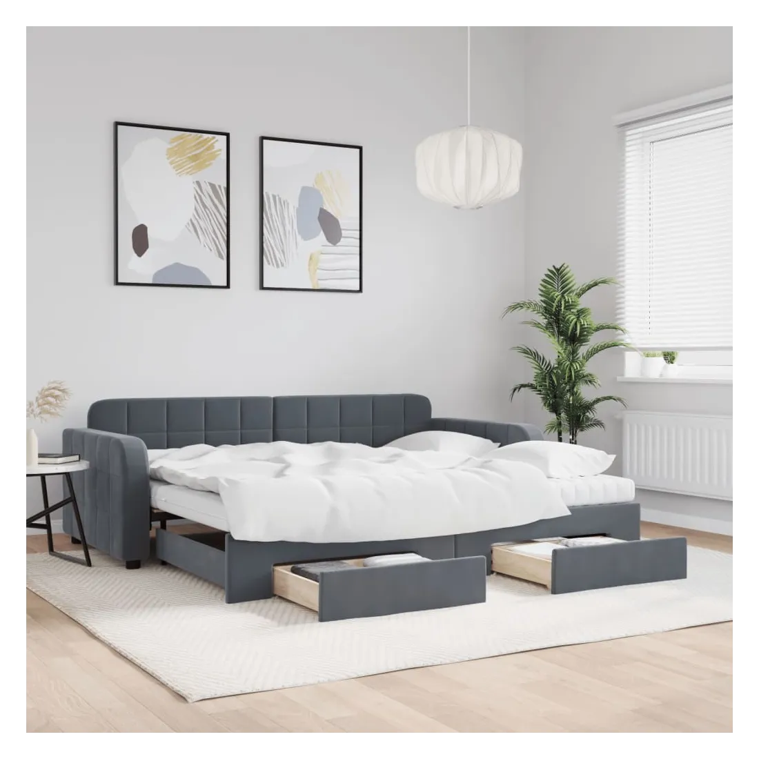 Ce lit de repos 2 en 1 avec lit gigogne, servant à la fois de canapé et de lit, constitue un supplément pratique et accrocheur à votre salon ou chambre à coucher. Lit de repos polyvalent : le canapé-lit fonctionne comme un canapé pendant la journée et se transforme facilement en lit double la nuit en retirant le lit gigogne, offrant une solution pratique pour accueillir des invités et maximiser l'espace.Grand espace de rangement : ce lit d'appoint dispose de deux tiroirs à roulettes qui offrent suffisamment d'espace pour ranger vos vêtements, chaussettes, jouets, coussins, etc.Matelas en mousse confortable : ce lit est fourni avec deux matelas en mousse pour un soutien maximal et un confort optimal.Velours doux et construction solide : ce canapé-lit a un cadre robuste en bois et en métal et est recouvert de velours doux et confortable.