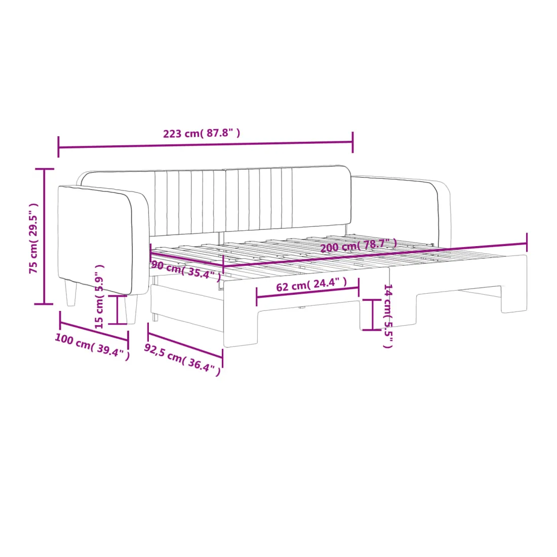 Ce lit de repos 2 en 1 avec lit gigogne, servant à la fois de canapé et de lit, constitue un supplément pratique et accrocheur à votre salon ou chambre à coucher. Lit de repos polyvalent : le canapé-lit fonctionne comme un canapé pendant la journée et se transforme facilement en lit double la nuit en retirant le lit gigogne, offrant une solution pratique pour accueillir des invités et maximiser l'espace.Velours doux et construction solide : ce canapé-lit a un cadre robuste en bois et en métal et est recouvert de velours doux et confortable.Design moderne : le canapé-lit a un design moderne qui présente des lignes épurées, un aspect minimaliste, ainsi que de la lumière naturelle, et ajoutera un style moderne à votre intérieur ! Bon à savoir :Les matelas ne sont pas inclus avec ce lit. Nous proposons une sélection variée de matelas. Vous pouvez consulter notre boutique pour trouver les matelas assortis.