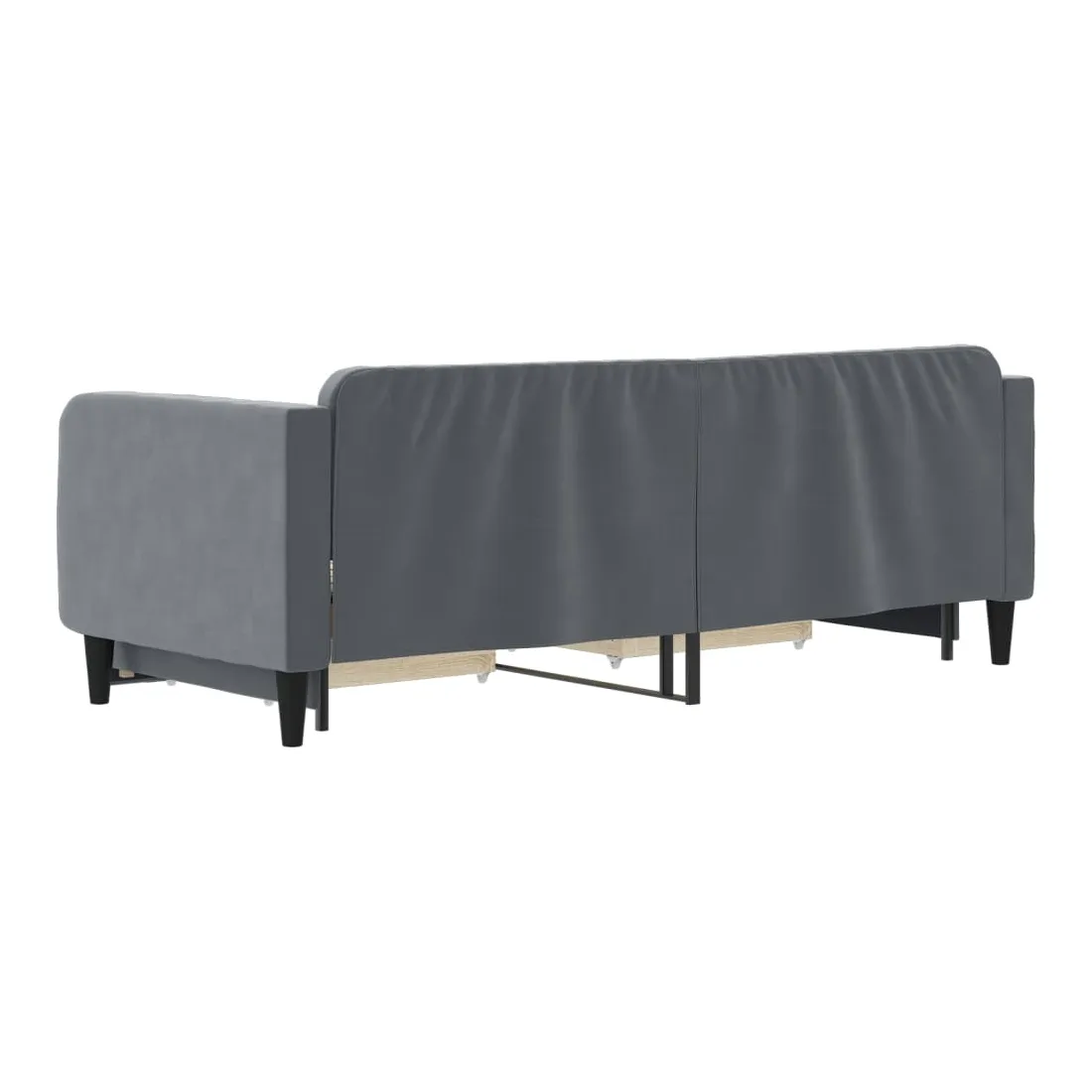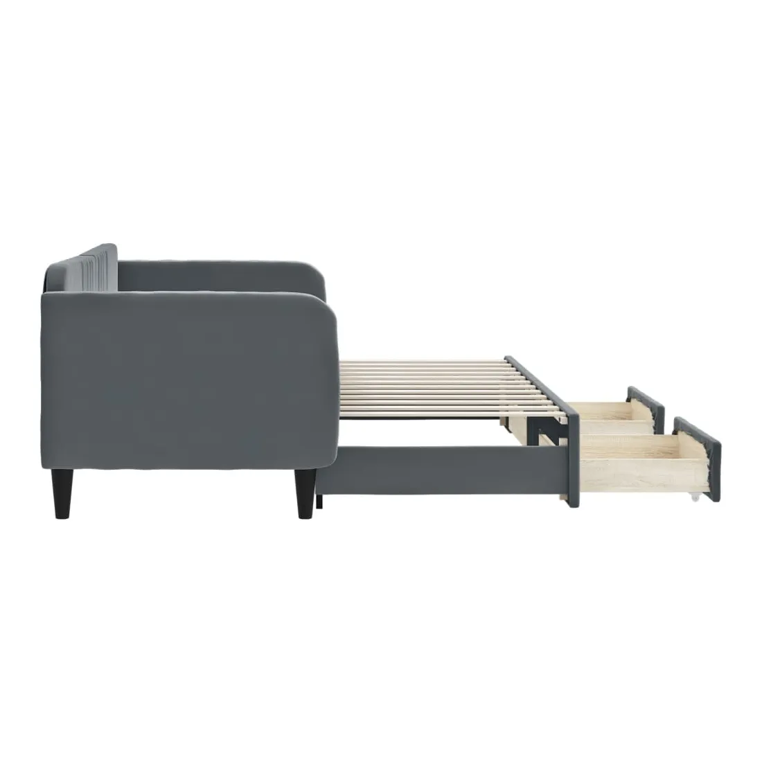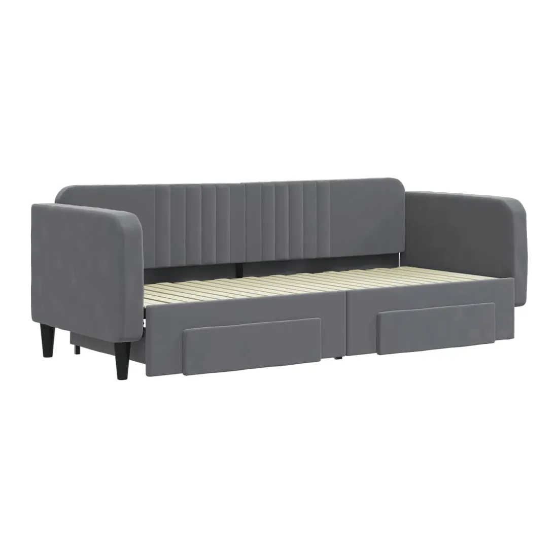 Ce lit de repos 2 en 1 avec lit gigogne, servant à la fois de canapé et de lit, constitue un supplément pratique et accrocheur à votre salon ou chambre à coucher. Lit de repos polyvalent : le canapé-lit fonctionne comme un canapé pendant la journée et se transforme facilement en lit double la nuit en retirant le lit gigogne, offrant une solution pratique pour accueillir des invités et maximiser l'espace.Grand espace de rangement : ce lit d'appoint dispose de deux tiroirs à roulettes qui offrent suffisamment d'espace pour ranger vos vêtements, chaussettes, jouets, coussins, etc.Velours doux et construction solide : ce canapé-lit a un cadre robuste en bois et en métal et est recouvert de velours doux et confortable.Design moderne : le canapé-lit a un design moderne qui présente des lignes épurées, un aspect minimaliste, ainsi que de la lumière naturelle, et ajoutera un style moderne à votre intérieur ! Bon à savoir :Les matelas ne sont pas inclus avec ce lit. Nous proposons une sélection variée de matelas. Vous pouvez consulter notre boutique pour trouver les matelas assortis.