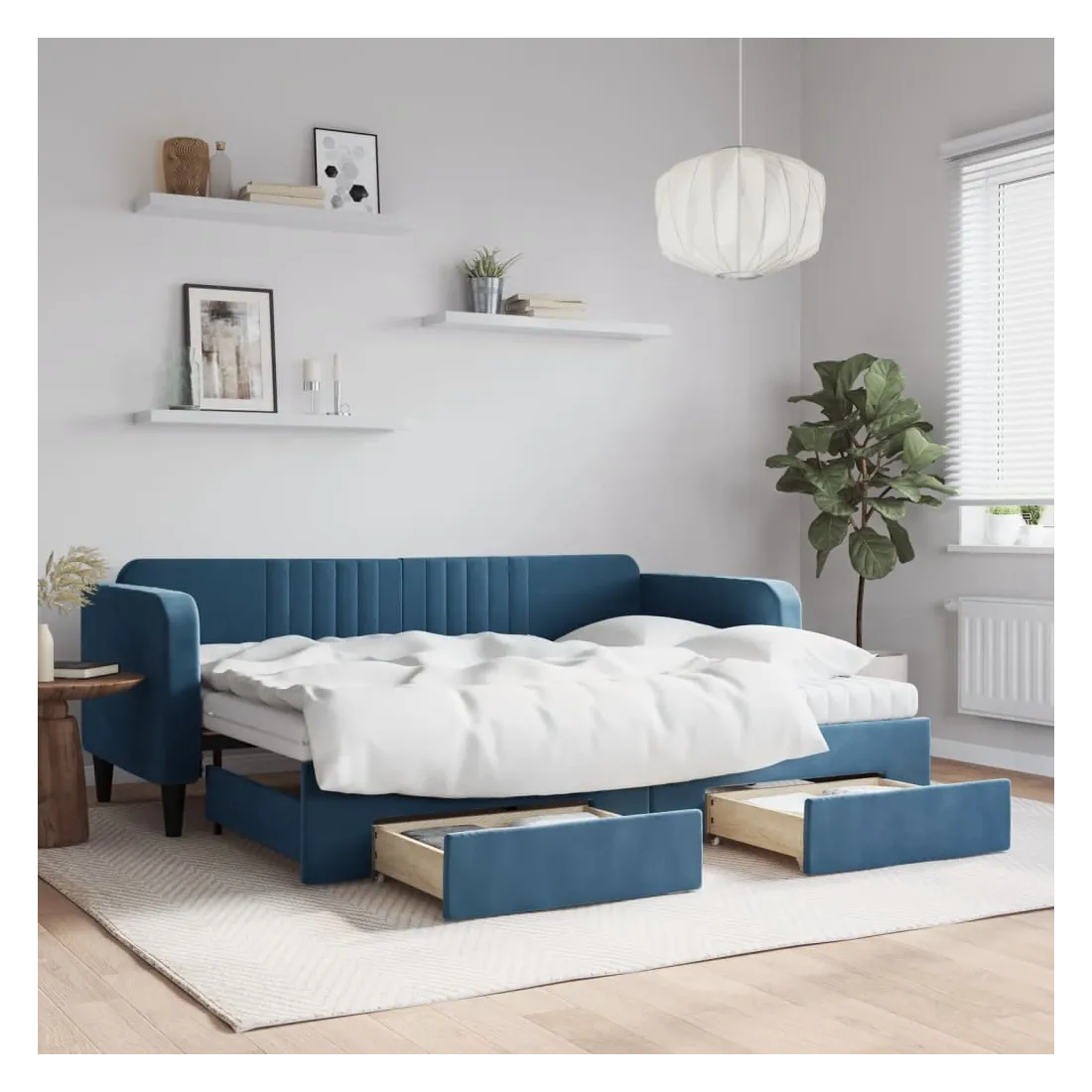 Ce lit de repos 2 en 1 avec lit gigogne, servant à la fois de canapé et de lit, constitue un supplément pratique et accrocheur à votre salon ou chambre à coucher. Lit de repos polyvalent : le canapé-lit fonctionne comme un canapé pendant la journée et se transforme facilement en lit double la nuit en retirant le lit gigogne, offrant une solution pratique pour accueillir des invités et maximiser l'espace.Grand espace de rangement : ce lit d'appoint dispose de deux tiroirs à roulettes qui offrent suffisamment d'espace pour ranger vos vêtements, chaussettes, jouets, coussins, etc.Matelas en mousse confortable : ce lit est fourni avec deux matelas en mousse pour un soutien maximal et un confort optimal.Velours doux et construction solide : ce canapé-lit a un cadre robuste en bois et en métal et est recouvert de velours doux et confortable.