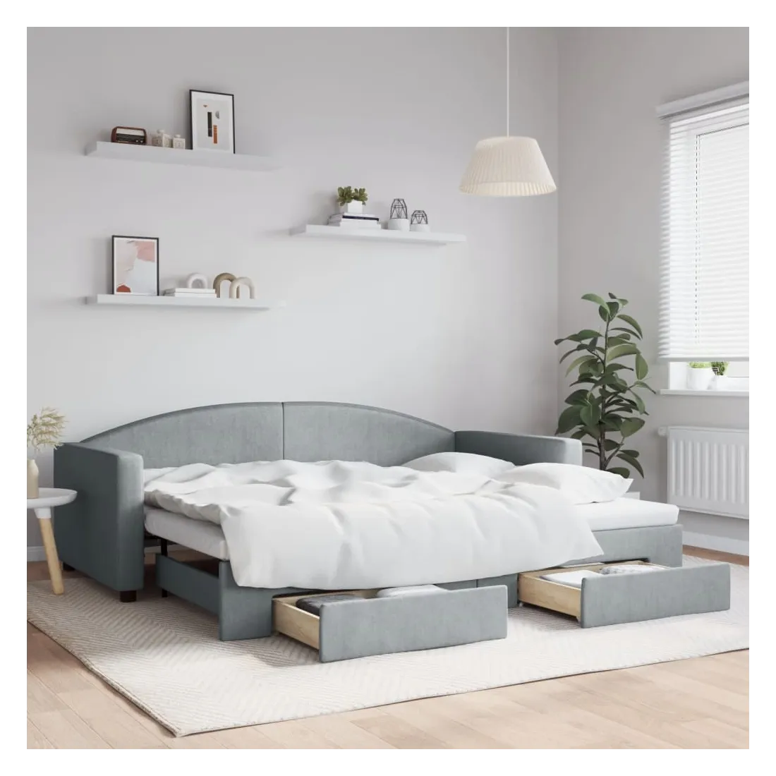Ce lit de repos 2 en 1 avec lit gigogne, servant à la fois de canapé et de lit, constitue un supplément pratique et accrocheur à votre salon ou chambre à coucher. Lit de repos polyvalent : le canapé-lit fonctionne comme un canapé pendant la journée et se transforme facilement en lit double la nuit en retirant le lit gigogne, offrant une solution pratique pour accueillir des invités et maximiser l'espace.Grand espace de rangement : ce lit d'appoint dispose de deux tiroirs à roulettes qui offrent suffisamment d'espace pour ranger vos vêtements, chaussettes, jouets, coussins, etc.Tissu durable et construction solide : ce canapé-lit a une structure robuste en bois et en métal et est recouvert d'un tissu durable et confortable. Bon à savoir :Les matelas ne sont pas inclus avec ce lit. Nous proposons une sélection variée de matelas. Vous pouvez consulter notre boutique pour trouver les matelas assortis.