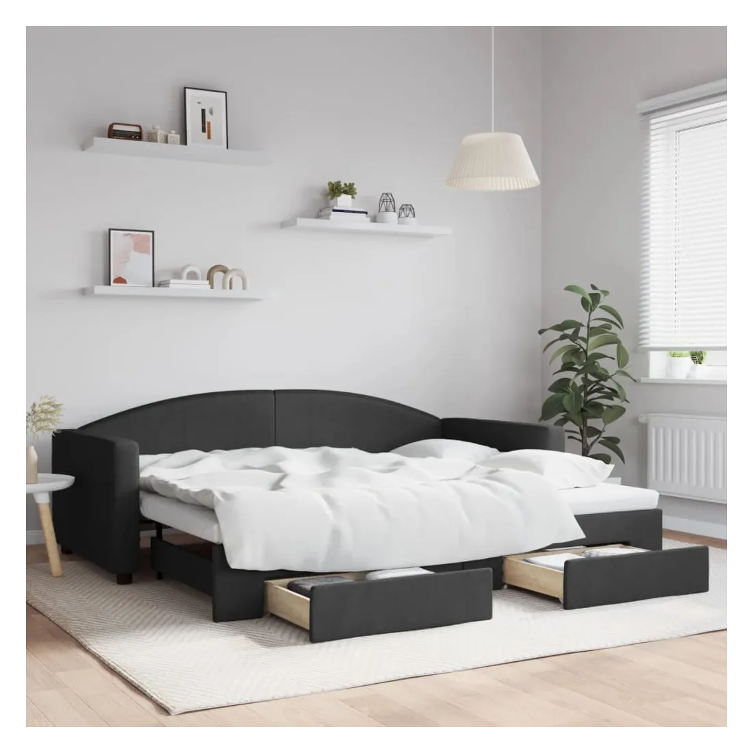 Ce lit de repos 2 en 1 avec lit gigogne, servant à la fois de canapé et de lit, constitue un supplément pratique et accrocheur à votre salon ou chambre à coucher. Lit de repos polyvalent : le canapé-lit fonctionne comme un canapé pendant la journée et se transforme facilement en lit double la nuit en retirant le lit gigogne, offrant une solution pratique pour accueillir des invités et maximiser l'espace.Grand espace de rangement : ce lit d'appoint dispose de deux tiroirs à roulettes qui offrent suffisamment d'espace pour ranger vos vêtements, chaussettes, jouets, coussins, etc.Tissu durable et construction solide : ce canapé-lit a une structure robuste en bois et en métal et est recouvert d'un tissu durable et confortable. Bon à savoir :Les matelas ne sont pas inclus avec ce lit. Nous proposons une sélection variée de matelas. Vous pouvez consulter notre boutique pour trouver les matelas assortis.