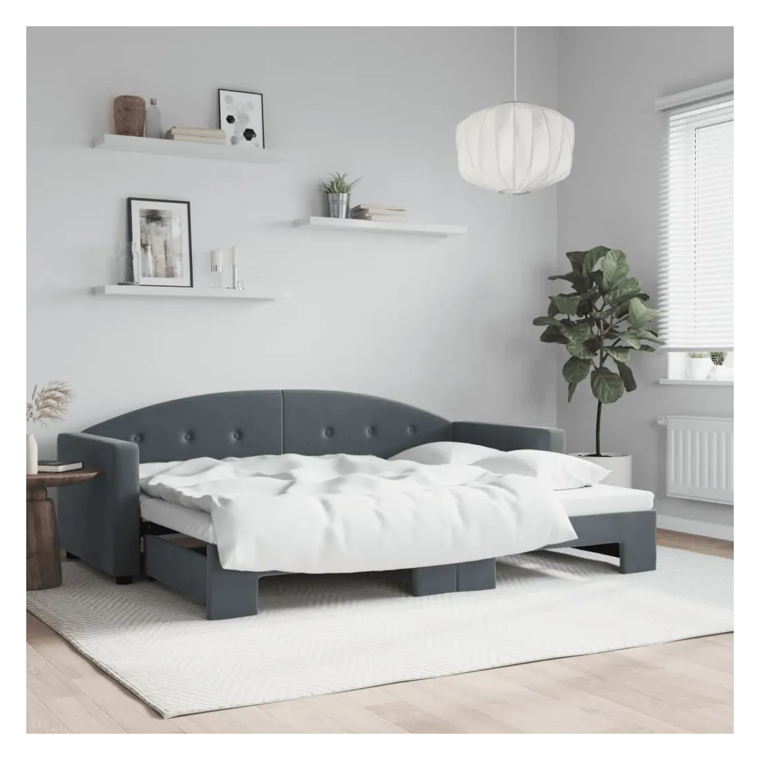 Ce lit de repos 2 en 1 avec lit gigogne, servant à la fois de canapé et de lit, constitue un supplément pratique et accrocheur à votre salon ou chambre à coucher. Lit de repos polyvalent : le canapé-lit fonctionne comme un canapé pendant la journée et se transforme facilement en lit double la nuit en retirant le lit gigogne, offrant une solution pratique pour accueillir des invités et maximiser l'espace.Velours doux et construction solide : ce canapé-lit a un cadre robuste en bois et en métal et est recouvert de velours doux et confortable.Design moderne : le canapé-lit a un design moderne qui présente des lignes épurées, un aspect minimaliste, ainsi que de la lumière naturelle, et ajoutera un style moderne à votre intérieur ! Bon à savoir :Les matelas ne sont pas inclus avec ce lit. Nous proposons une sélection variée de matelas. Vous pouvez consulter notre boutique pour trouver les matelas assortis.