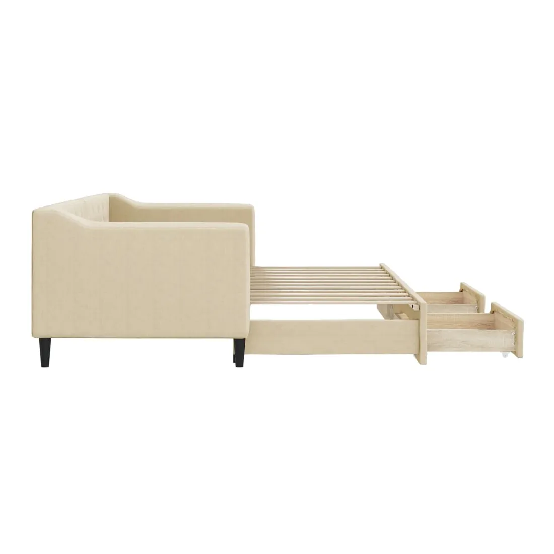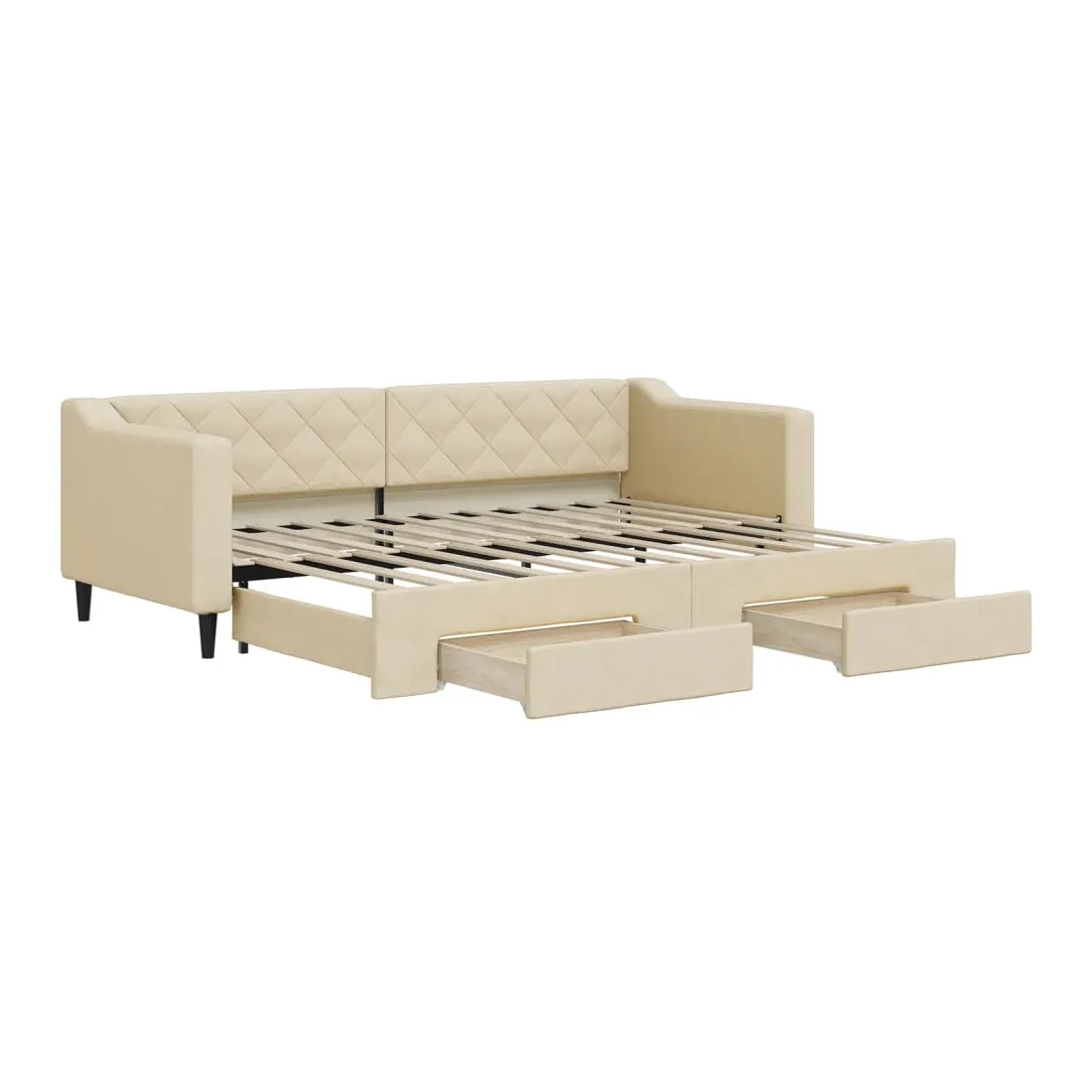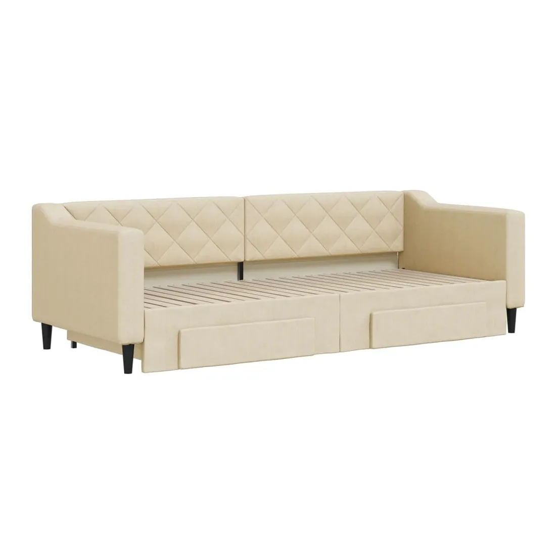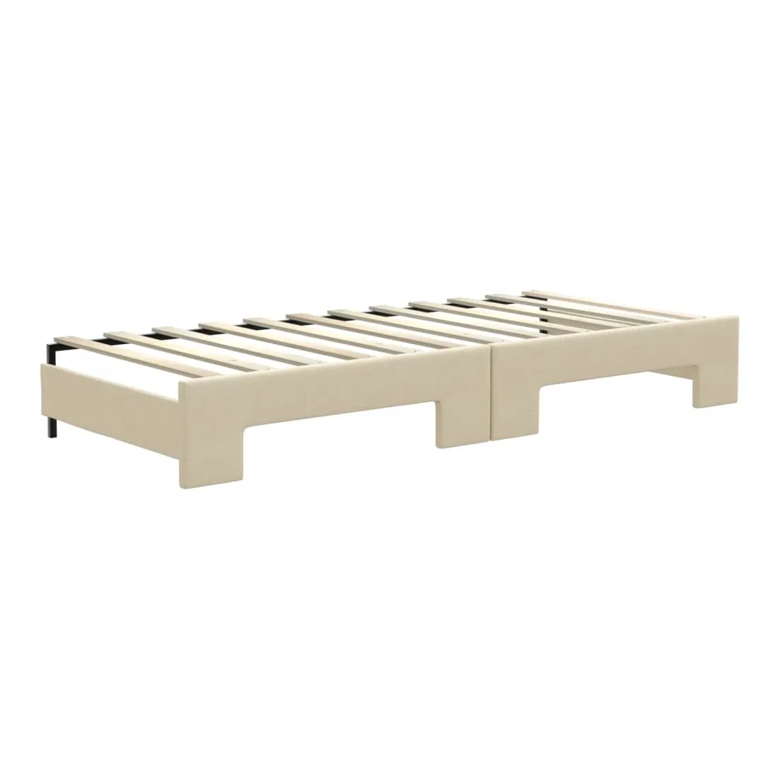 Ce lit de repos 2 en 1 avec lit gigogne, servant à la fois de canapé et de lit, constitue un supplément pratique et accrocheur à votre salon ou chambre à coucher. Lit de repos polyvalent : le canapé-lit fonctionne comme un canapé pendant la journée et se transforme facilement en lit double la nuit en retirant le lit gigogne, offrant une solution pratique pour accueillir des invités et maximiser l'espace. Grand espace de rangement : ce lit d'appoint dispose de deux tiroirs à roulettes qui offrent suffisamment d'espace pour ranger vos vêtements, chaussettes, jouets, coussins, etc. Tissu durable et construction solide : ce canapé-lit a une structure robuste en bois et en métal et est recouvert d'un tissu durable et confortable.Design moderne : le canapé-lit a un design moderne qui présente des lignes épurées, un aspect minimaliste, et ajoutera un style moderne à votre intérieur ! Bon à savoir :Les matelas ne sont pas inclus avec ce lit. Nous proposons une sélection variée de matelas. Vous pouvez consulter notre boutique pour trouver les matelas assortis.