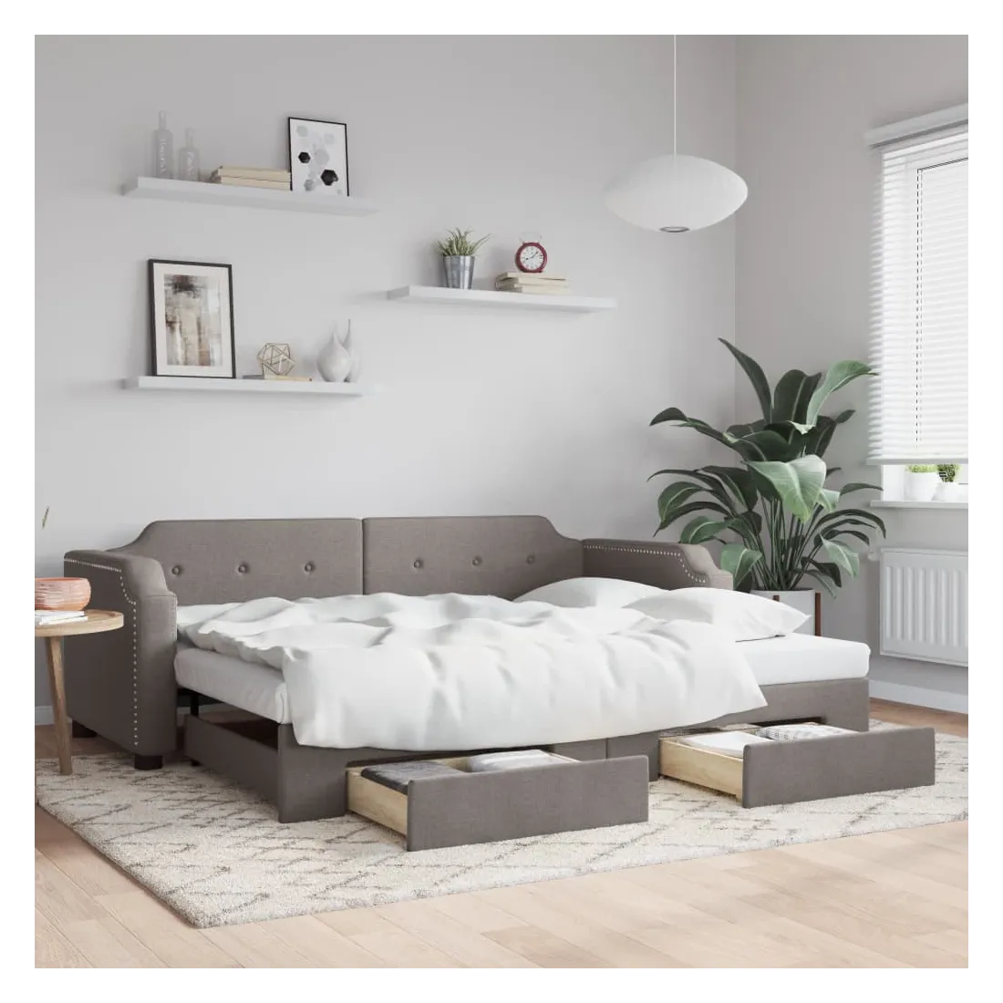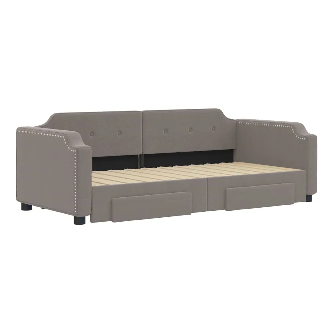 Ce lit de repos 2 en 1 avec lit gigogne, servant à la fois de canapé et de lit, constitue un supplément pratique et accrocheur à votre salon ou chambre à coucher. Lit de repos polyvalent : le canapé-lit fonctionne comme un canapé pendant la journée et se transforme facilement en lit double la nuit en retirant le lit gigogne, offrant une solution pratique pour accueillir des invités et maximiser l'espace. Grand espace de rangement : ce lit d'appoint dispose de deux tiroirs à roulettes qui offrent suffisamment d'espace pour ranger vos vêtements, chaussettes, jouets, coussins, etc. Tissu durable et construction solide : ce canapé-lit a une structure robuste en bois et en métal et est recouvert d'un tissu durable et confortable. Bon à savoir :Les matelas ne sont pas inclus avec ce lit de repos. Nous proposons une sélection variée de matelas. Vous pouvez consulter notre boutique pour les matelas assortis.