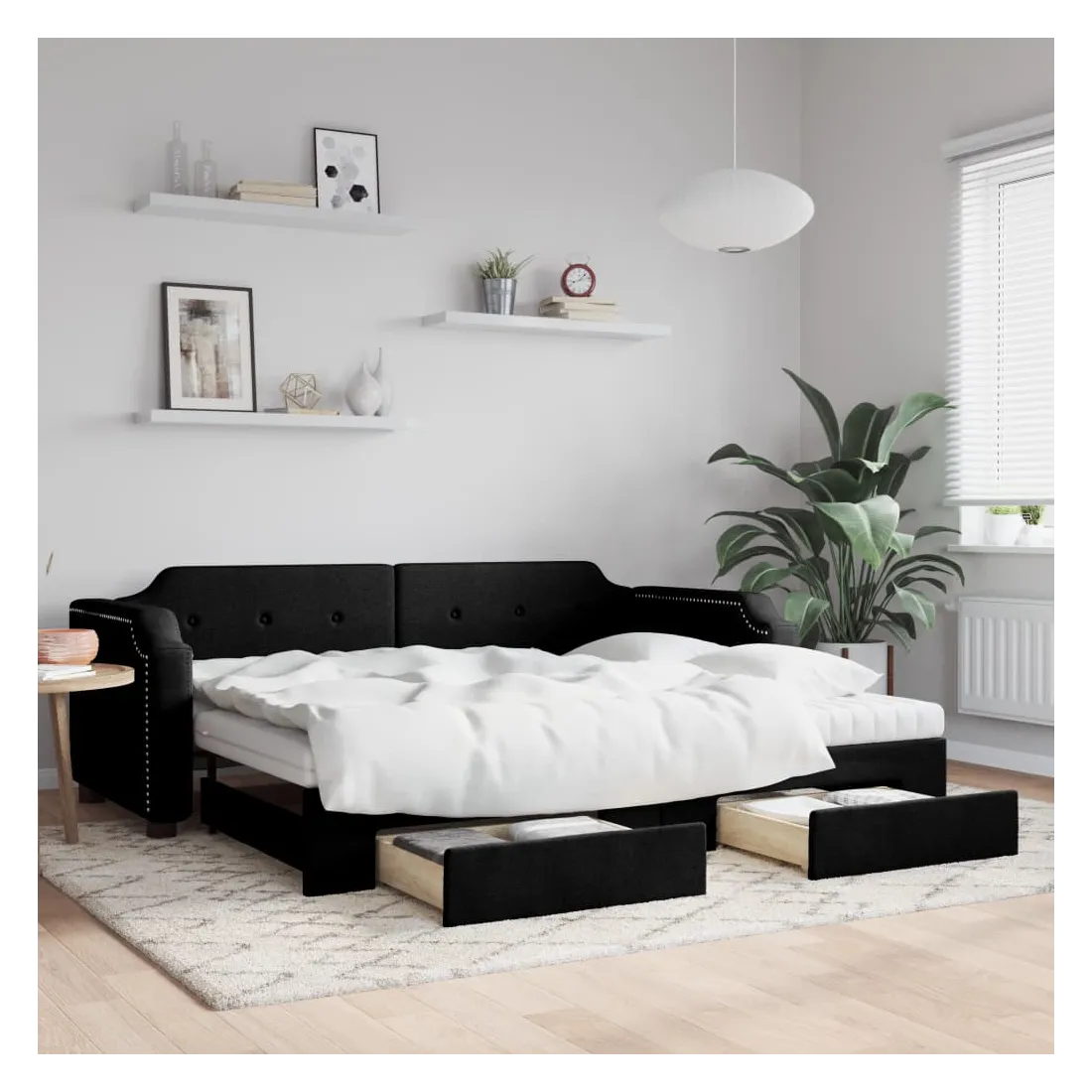 Ce lit de repos 2 en 1 avec lit gigogne, servant à la fois de canapé et de lit, constitue un supplément pratique et accrocheur à votre salon ou chambre à coucher. Lit de repos polyvalent : le canapé-lit fonctionne comme un canapé pendant la journée et se transforme facilement en lit double la nuit en retirant le lit gigogne, offrant une solution pratique pour accueillir des invités et maximiser l'espace. Grand espace de rangement : ce lit d'appoint dispose de deux tiroirs à roulettes qui offrent suffisamment d'espace pour ranger vos vêtements, chaussettes, jouets, coussins, etc. Matelas en mousse confortable : ce lit est fourni avec deux matelas en mousse pour un soutien maximal et un confort optimal. Tissu durable et construction solide : ce canapé-lit a une structure robuste en bois et en métal et est recouvert d'un tissu durable et confortable.