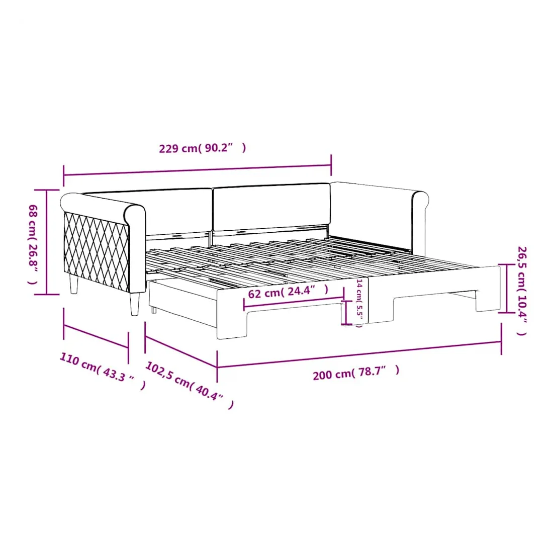 vidaXLCe lit de repos 2 en 1 avec lit gigogne, servant à la fois de canapé et de lit, constitue un supplément pratique et accrocheur à votre salon ou chambre à coucher. Lit de repos polyvalent : le canapé-lit fonctionne comme un canapé pendant la journée et se transforme facilement en lit double la nuit en retirant le lit gigogne, offrant une solution pratique pour accueillir des invités et maximiser l'espace.Velours doux et construction solide : ce canapé-lit a un cadre robuste en bois et en métal et est recouvert de velours doux et confortable.Design moderne : le canapé-lit a un design moderne qui présente des lignes épurées, un aspect minimaliste, ainsi que de la lumière naturelle, et ajoutera un style moderne à votre intérieur ! Bon à savoir :Les matelas ne sont pas inclus avec ce lit. Nous proposons une sélection variée de matelas. Vous pouvez consulter notre boutique pour trouver les matelas assortis.