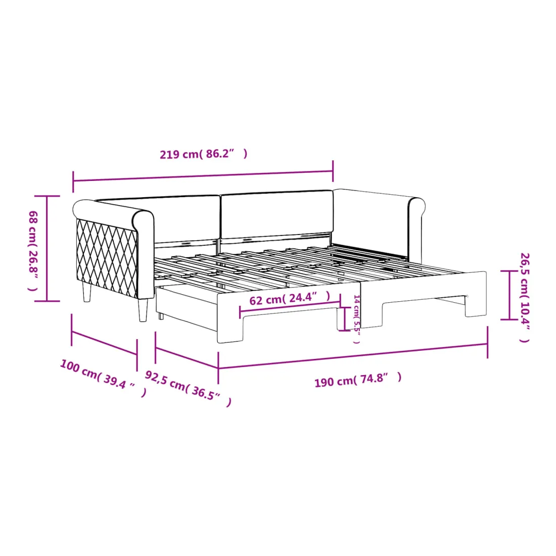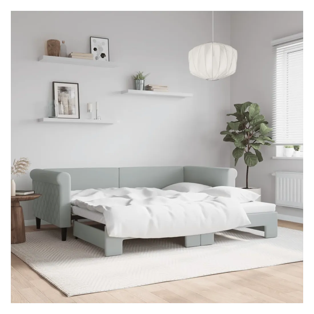 Ce lit de repos 2 en 1 avec lit gigogne, servant à la fois de canapé et de lit, constitue un supplément pratique et accrocheur à votre salon ou chambre à coucher. Lit de repos polyvalent : le canapé-lit fonctionne comme un canapé pendant la journée et se transforme facilement en lit double la nuit en retirant le lit gigogne, offrant une solution pratique pour accueillir des invités et maximiser l'espace.Velours doux et construction solide : ce canapé-lit a un cadre robuste en bois et en métal et est recouvert de velours doux et confortable.Design moderne : le canapé-lit a un design moderne qui présente des lignes épurées, un aspect minimaliste, ainsi que de la lumière naturelle, et ajoutera un style moderne à votre intérieur ! Bon à savoir :Les matelas ne sont pas inclus avec ce lit. Nous proposons une sélection variée de matelas. Vous pouvez consulter notre boutique pour trouver les matelas assortis.