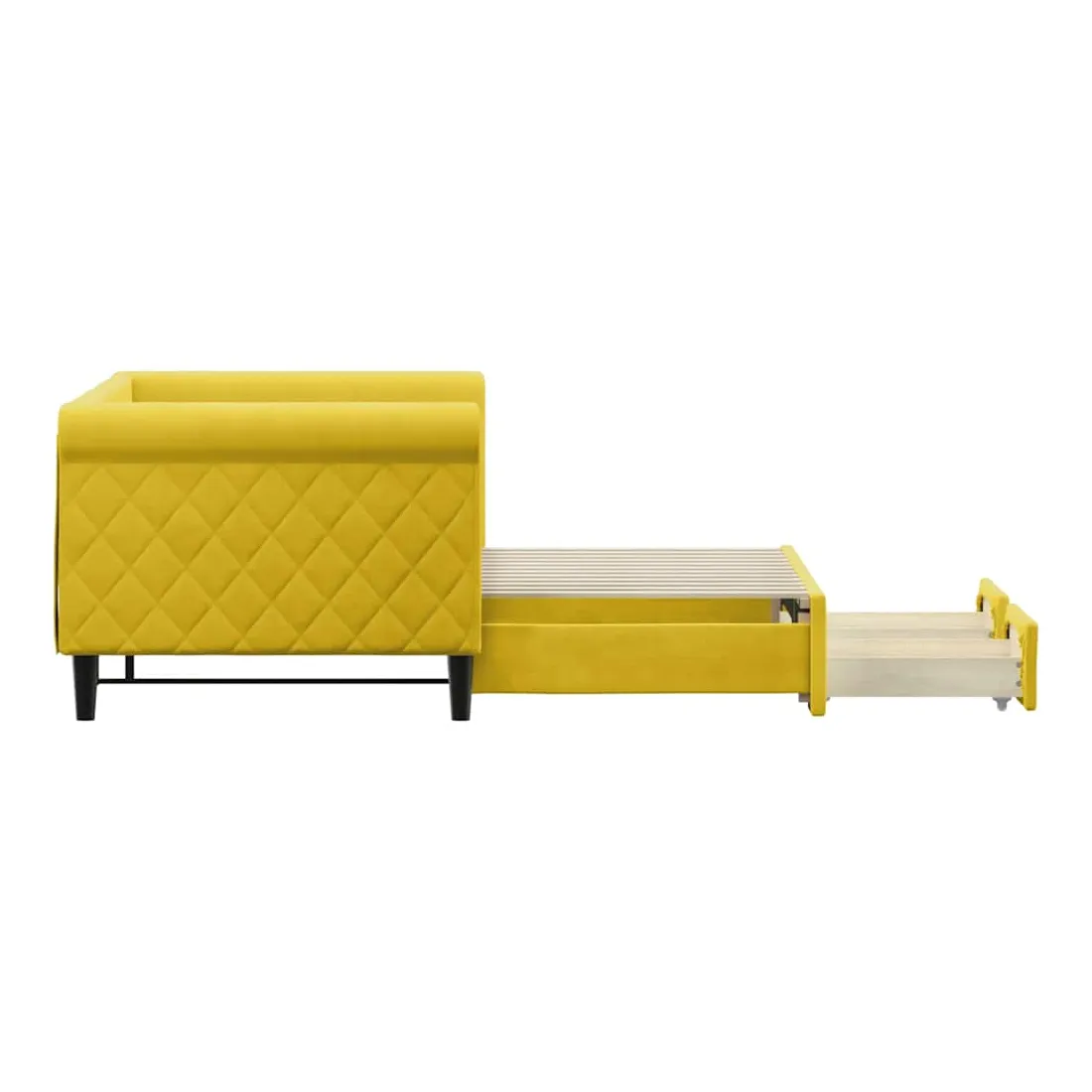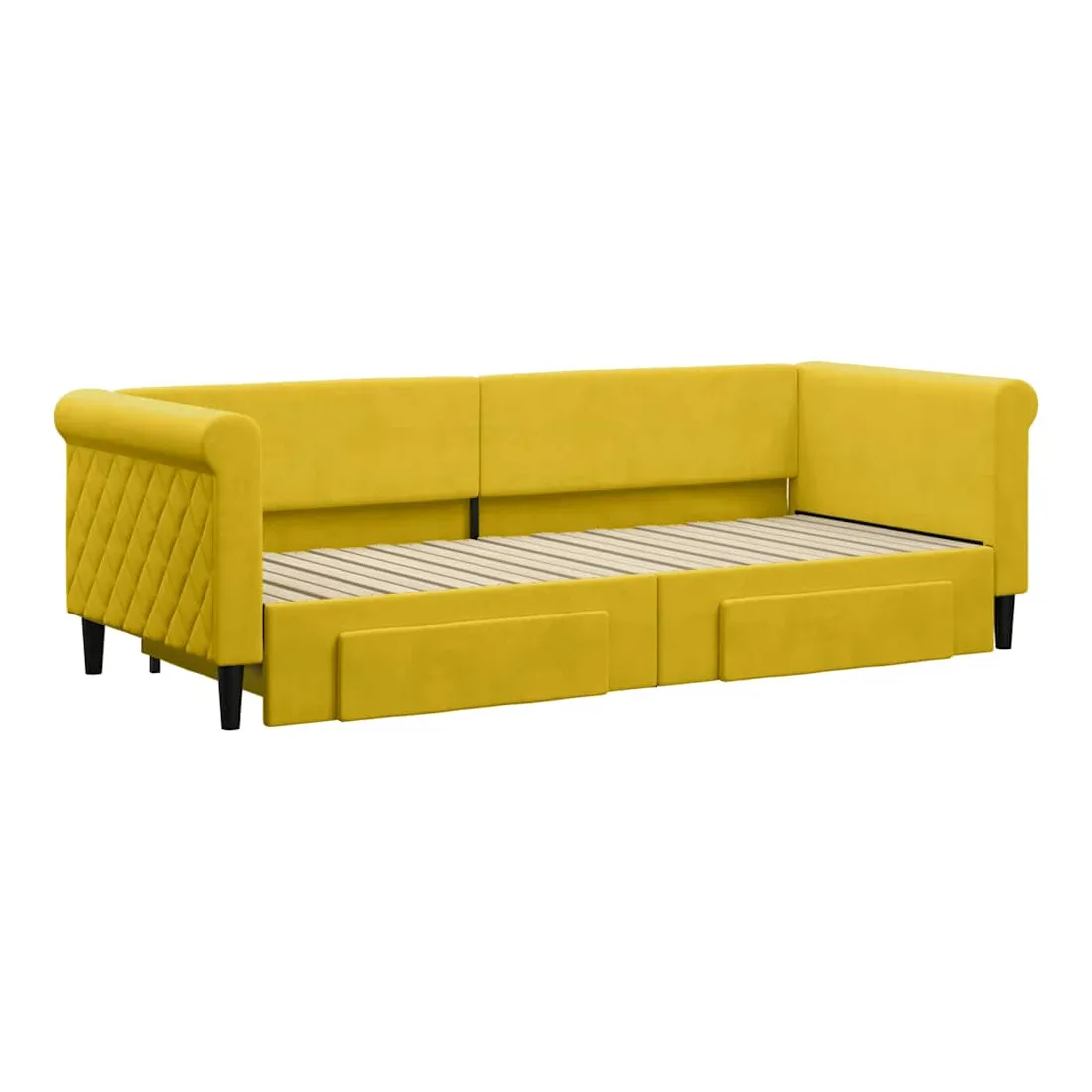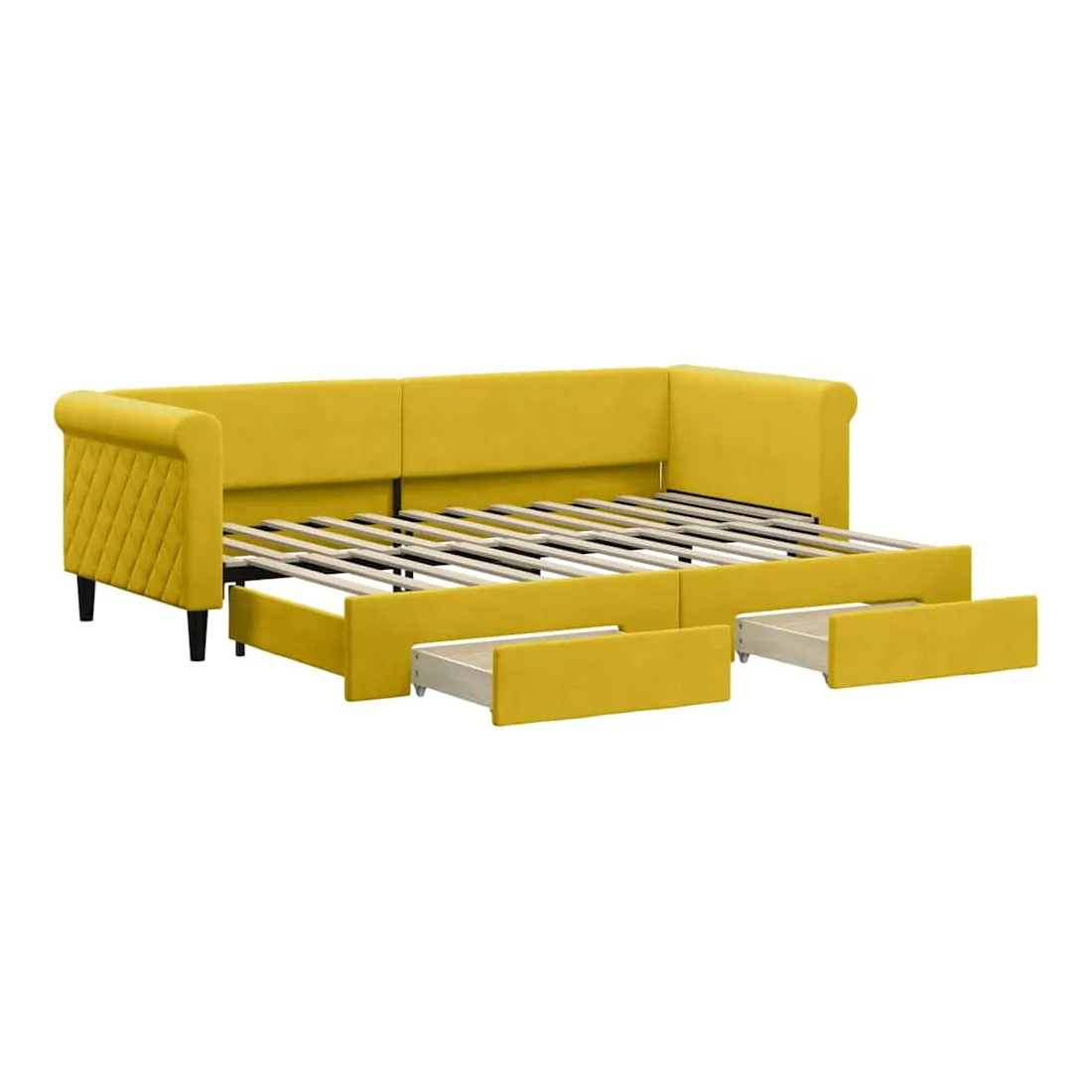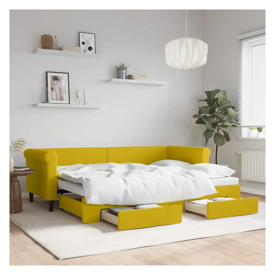 Ce lit de repos 2 en 1 avec lit gigogne, servant à la fois de canapé et de lit, constitue un supplément pratique et accrocheur à votre salon ou chambre à coucher. Lit de repos polyvalent : le canapé-lit fonctionne comme un canapé pendant la journée et se transforme facilement en lit double la nuit en retirant le lit gigogne, offrant une solution pratique pour accueillir des invités et maximiser l'espace.Grand espace de rangement : ce lit d'appoint dispose de deux tiroirs à roulettes qui offrent suffisamment d'espace pour ranger vos vêtements, chaussettes, jouets, coussins, etc.Velours doux et construction solide : ce canapé-lit a un cadre robuste en bois et en métal et est recouvert de velours doux et confortable.Design moderne : le canapé-lit a un design moderne qui présente des lignes épurées, un aspect minimaliste, ainsi que de la lumière naturelle, et ajoutera un style moderne à votre intérieur ! Bon à savoir :Les matelas ne sont pas inclus avec ce lit. Nous proposons une sélection variée de matelas. Vous pouvez consulter notre boutique pour trouver les matelas assortis.