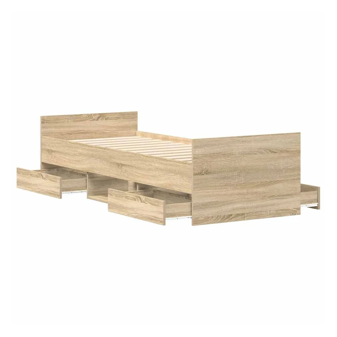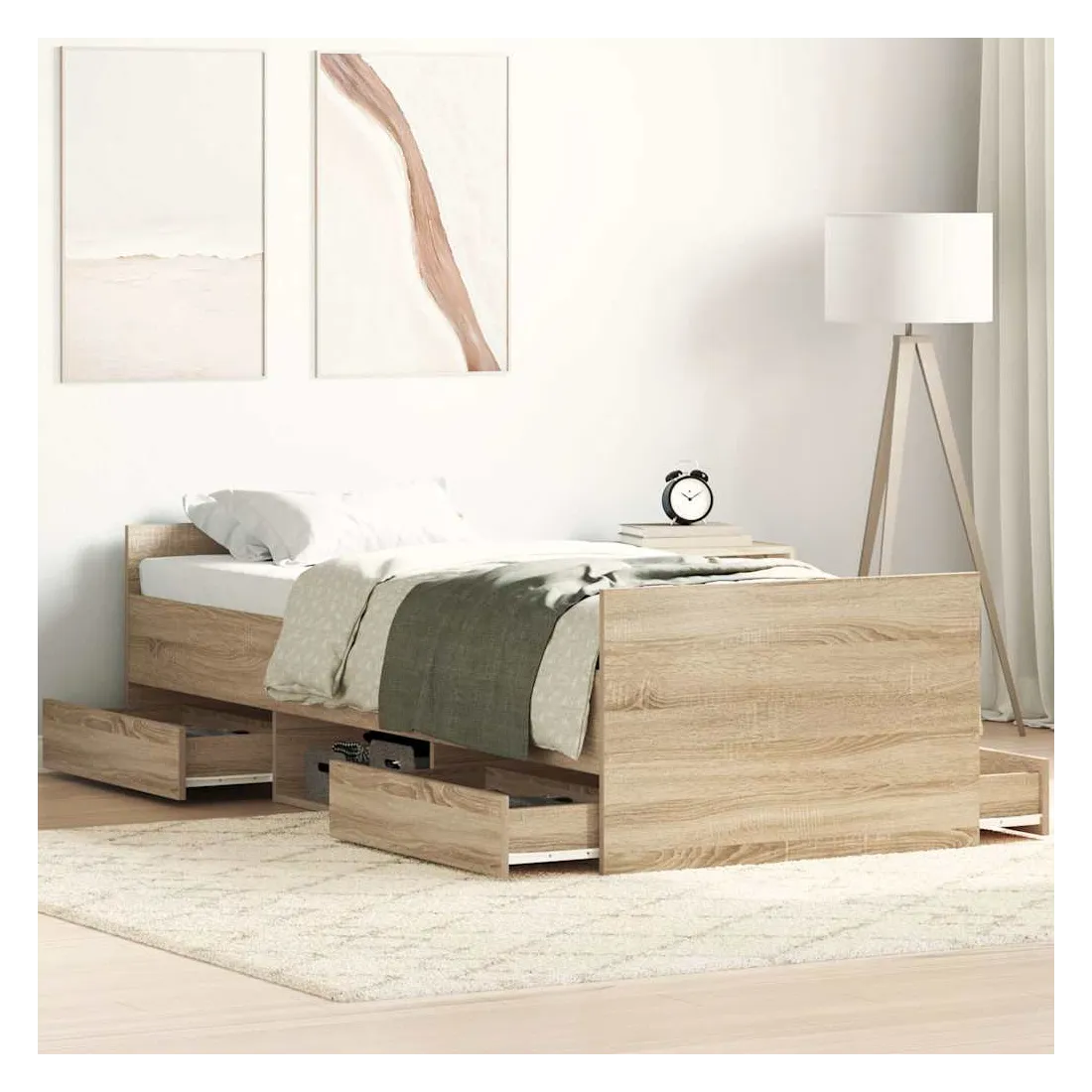 Obtenez une meilleure nuit de sommeil reposante grâce à ce cadre de lit ! Il est un supplément accueillant à toute chambre à coucher. Matériau durable : le bois d'ingénierie est d'une qualité exceptionnelle avec une surface lisse et présente également résistance, stabilité et résistance à l'humidité.Tête de lit et pied de lit fonctionnels : la tête et le pied de lit du sommier maintiennent votre matelas en place. De plus, la tête de lit vous offre un excellent soutien du dos lorsque vous vous asseyez dans le lit pour lire ou regarder la télévision.Grand espace de rangement : ce lit d'appoint dispose de 4 tiroirs et des étagères qui offrent suffisamment d'espace pour ranger vos vêtements, chaussettes, jouets, coussins, etc.Lattes robustes : les lattes de contreplaqué assurent une bonne répartition du poids, garantissant que le matelas reste en place à chaque torsion de votre corps pendant le sommeil. Bon à savoir :Un matelas n'est pas inclus avec ce lit. Nous offrons une sélection variée de matelas. Vous pouvez consulter notre boutique pour trouver un matelas assorti.