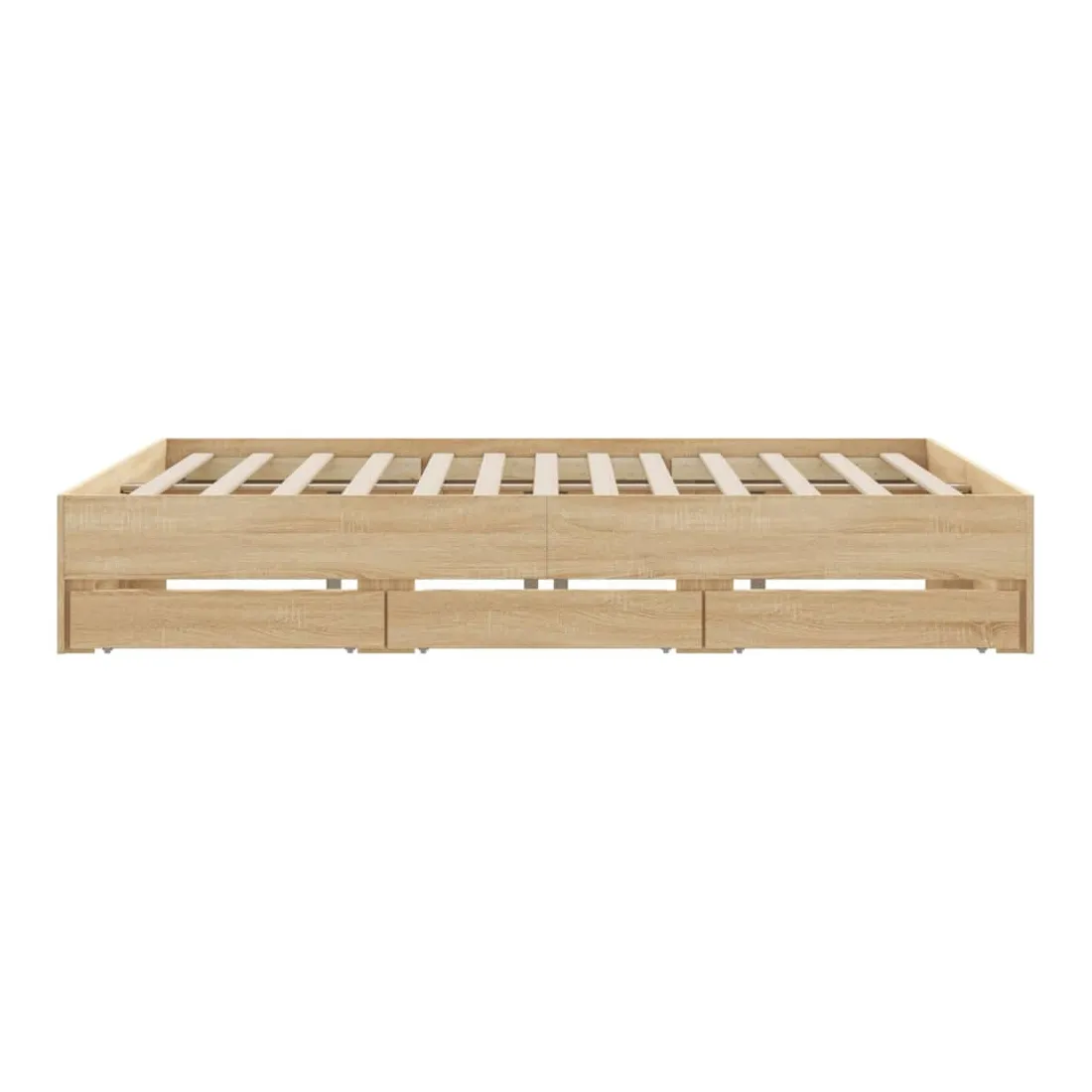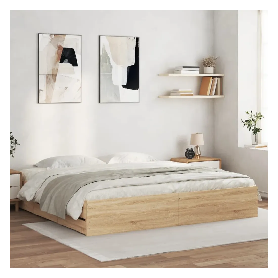 Ajoutez une touche moderne à votre chambre à coucher avec ce cadre de lit avec tiroirs ! Il apportera une touche pratique et décorative à votre espace de vie. Matériau durable : le cadre de lit est fabriquée en bois d'ingénierie. Le bois d'ingénierie est d'une qualité exceptionnelle avec une surface lisse et présente également de la résistance, de la stabilité et de la résistance à l'humidité.Lattes robustes : les lattes de contreplaqué assurent une bonne répartition du poids, garantissant que le matelas reste en place à chaque torsion de votre corps pendant le sommeil.Fonction de rangement : les tiroirs de lit inclus offrent suffisamment d'espace de rangement pour ranger vos articles essentiels, gardant votre pièce propre et bien rangée. Bon à savoir :Un matelas n'est pas inclus avec ce lit. Nous offrons une sélection variée de matelas. Vous pouvez consulter notre boutique pour trouver un matelas assorti.
