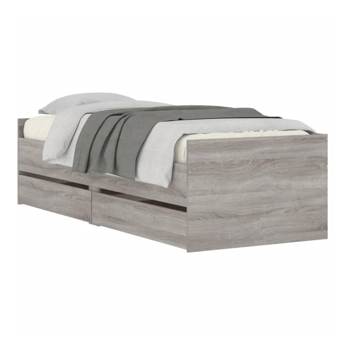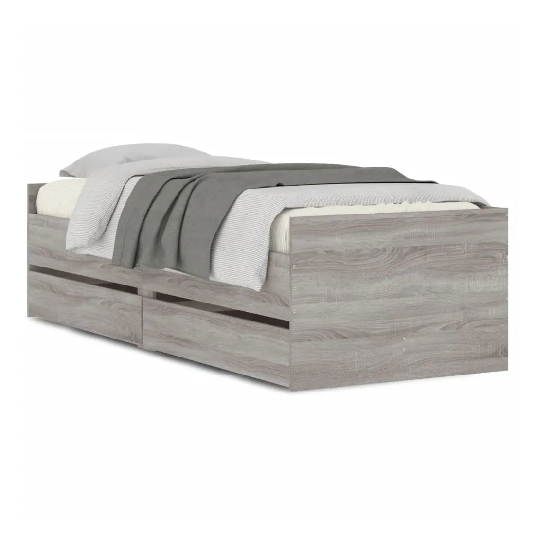 Ajoutez une touche moderne à votre chambre à coucher avec ce cadre de lit avec tiroirs ! Il apportera une touche pratique et décorative à votre espace de vie. Matériau durable : le cadre de lit est fabriquée en bois d'ingénierie. Le bois d'ingénierie est d'une qualité exceptionnelle avec une surface lisse et présente également de la résistance, de la stabilité et de la résistance à l'humidité.Lattes robustes : les lattes de contreplaqué assurent une bonne répartition du poids, garantissant que le matelas reste en place à chaque torsion de votre corps pendant le sommeil.Fonction de rangement : les tiroirs de lit inclus offrent suffisamment d'espace de rangement pour ranger vos articles essentiels, gardant votre pièce propre et bien rangée. Bon à savoir :Un matelas n'est pas inclus avec ce lit. Nous offrons une sélection variée de matelas. Vous pouvez consulter notre boutique pour trouver un matelas assorti.