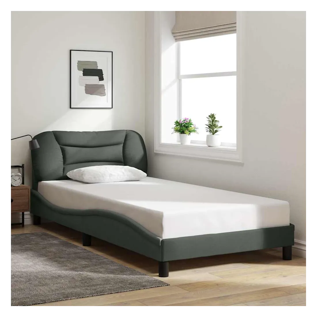 Obtenez une meilleure nuit de sommeil reposante grâce à ce cadre de lit avec tête de lit ! Il est un supplément accueillant à toute chambre à coucher. Tissu durable : le tissu présente un aspect simple et épuré tout en restant respirant, doux pour la peau et durable.Lattes de contreplaqué : les lattes de contreplaqué assurent une bonne répartition du poids, garantissant que le matelas reste en place à chaque torsion de votre corps pendant le sommeil.Excellent soutien : l'oreiller de tête de lit est rembourré avec de la fibre de polypropylène pour un confort ultra doux et optimal vous offre un excellent soutien du dos lorsque vous êtes assis dans votre lit pour lire ou regarder la télévision.Design pratique : le coussin de la tête de lit est doté d'une fermeture à glissière pour faciliter l'installation, et les bandes auto-agrippantes au dos peuvent être utilisées pour fixer les lampes LED.Design latéral ondulé : l’aspect ondulé du cadre de lit est élégant et sophistiqué, ajoutant une touche moderne et élégante à votre décor, ce qui en fait le point central de votre chambre à coucher. Bon à savoir :Un matelas n'est pas inclus avec ce lit. Nous offrons une sélection variée de matelas. Vous pouvez consulter notre boutique pour trouver un matelas assorti.