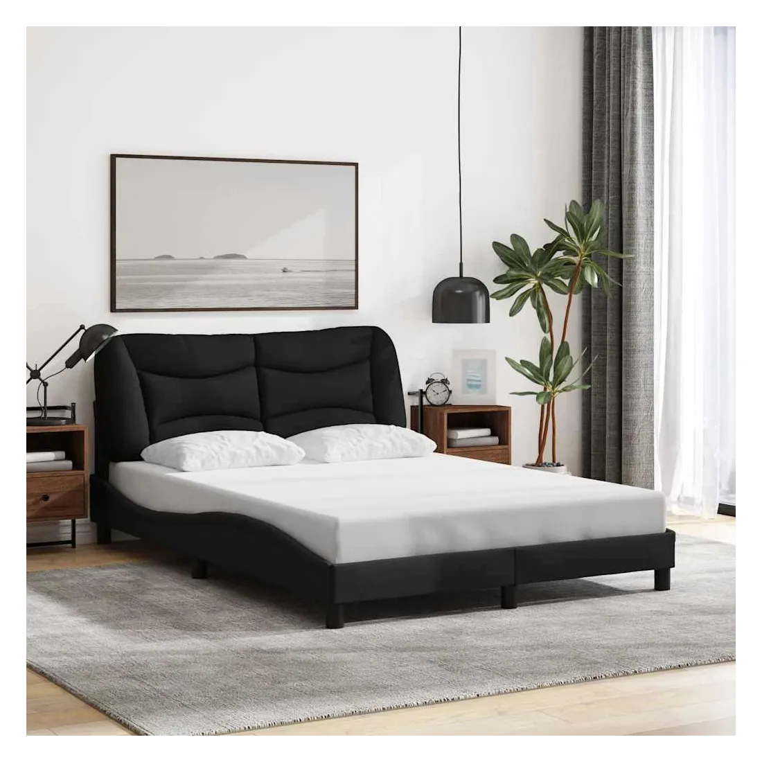 Obtenez une meilleure nuit de sommeil reposante grâce à ce cadre de lit avec tête de lit ! Il est un supplément accueillant à toute chambre à coucher. Tissu durable : le tissu présente un aspect simple et épuré tout en restant respirant, doux pour la peau et durable.Lattes de contreplaqué : les lattes de contreplaqué assurent une bonne répartition du poids, garantissant que le matelas reste en place à chaque torsion de votre corps pendant le sommeil.Excellent soutien : l'oreiller de tête de lit est rembourré avec de la fibre de polypropylène pour un confort ultra doux et optimal vous offre un excellent soutien du dos lorsque vous êtes assis dans votre lit pour lire ou regarder la télévision.Design pratique : le coussin de la tête de lit est doté d'une fermeture à glissière pour faciliter l'installation, et les bandes auto-agrippantes au dos peuvent être utilisées pour fixer les lampes LED.Design latéral ondulé : l’aspect ondulé du cadre de lit est élégant et sophistiqué, ajoutant une touche moderne et élégante à votre décor, ce qui en fait le point central de votre chambre à coucher. Bon à savoir :Un matelas n'est pas inclus avec ce lit. Nous offrons une sélection variée de matelas. Vous pouvez consulter notre boutique pour trouver un matelas assorti.