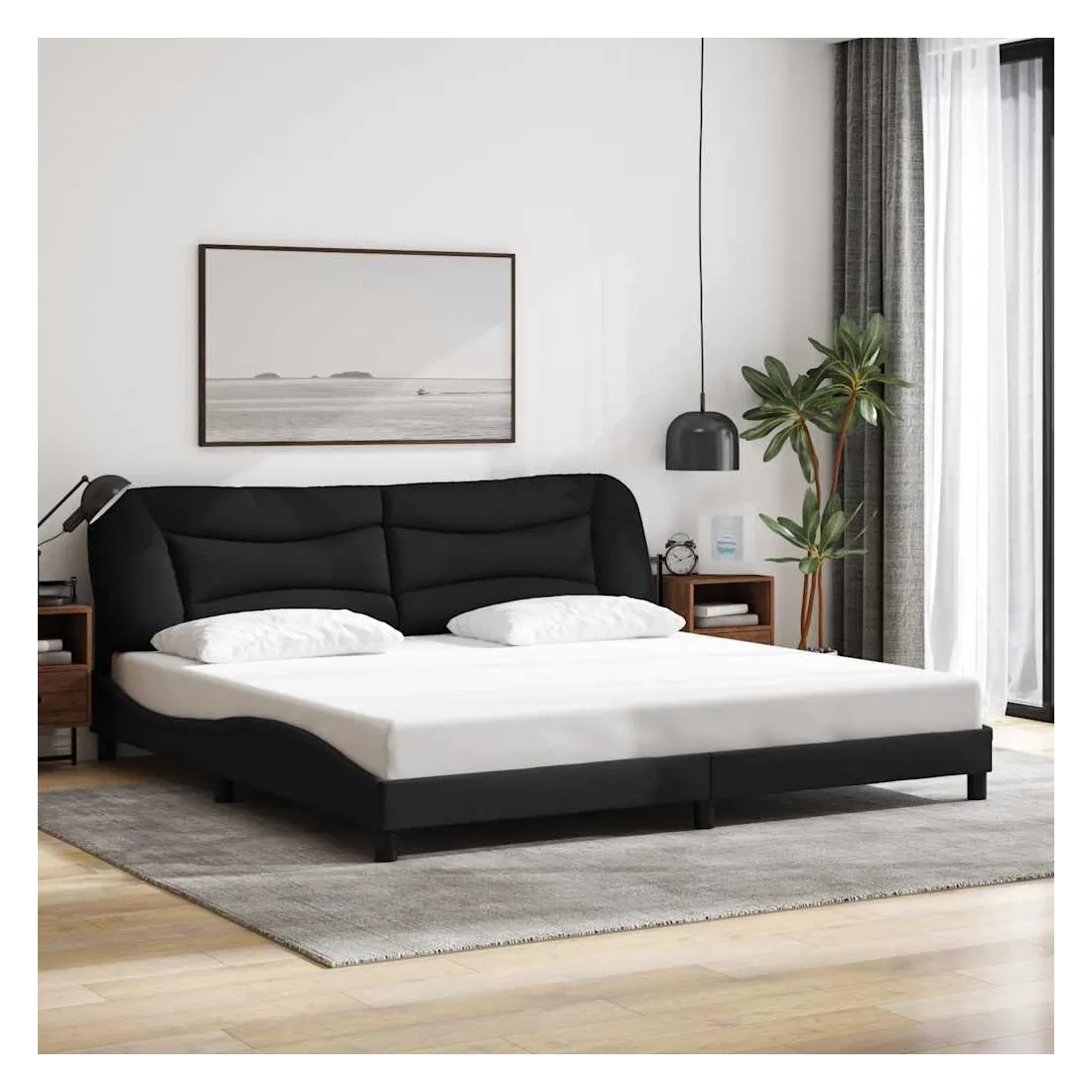 Obtenez une meilleure nuit de sommeil reposante grâce à ce cadre de lit avec tête de lit ! Il est un supplément accueillant à toute chambre à coucher. Tissu durable : le tissu présente un aspect simple et épuré tout en restant respirant, doux pour la peau et durable.Lattes de contreplaqué : les lattes de contreplaqué assurent une bonne répartition du poids, garantissant que le matelas reste en place à chaque torsion de votre corps pendant le sommeil.Excellent soutien : l'oreiller de tête de lit est rembourré avec de la fibre de polypropylène pour un confort ultra doux et optimal vous offre un excellent soutien du dos lorsque vous êtes assis dans votre lit pour lire ou regarder la télévision.Design pratique : le coussin de la tête de lit est doté d'une fermeture à glissière pour faciliter l'installation, et les bandes auto-agrippantes au dos peuvent être utilisées pour fixer les lampes LED.Design latéral ondulé : l’aspect ondulé du cadre de lit est élégant et sophistiqué, ajoutant une touche moderne et élégante à votre décor, ce qui en fait le point central de votre chambre à coucher. Bon à savoir :Un matelas n'est pas inclus avec ce lit. Nous offrons une sélection variée de matelas. Vous pouvez consulter notre boutique pour trouver un matelas assorti.