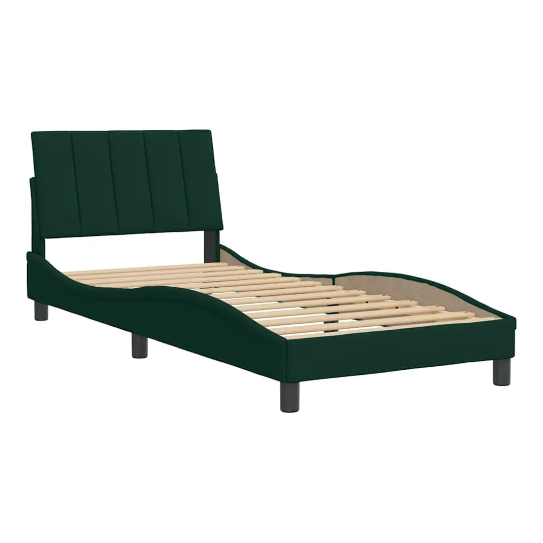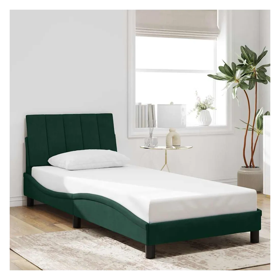 Obtenez une meilleure nuit de sommeil reposante grâce à ce cadre de lit avec tête de lit ! Il est un supplément accueillant à toute chambre à coucher. Velours doux : le velours est un tissu doux et confortable, agréable au toucher.Lattes de contreplaqué : les lattes de contreplaqué assurent une bonne répartition du poids, garantissant que le matelas reste en place à chaque torsion de votre corps pendant le sommeil.Excellent soutien : l'oreiller de tête de lit est rembourré avec de la mousse pour un confort ultra doux et optimal vous offre un excellent soutien du dos lorsque vous êtes assis dans votre lit pour lire ou regarder la télévision.Design pratique : le coussin de la tête de lit est doté d'une fermeture à glissière pour faciliter l'installation, et les bandes auto-agrippantes au dos peuvent être utilisées pour fixer les lampes LED.Design latéral ondulé : l’aspect ondulé du cadre de lit est élégant et sophistiqué, ajoutant une touche moderne et élégante à votre décor, ce qui en fait le point central de votre chambre à coucher. Bon à savoir :Un matelas n'est pas inclus avec ce lit. Nous offrons une sélection variée de matelas. Vous pouvez consulter notre boutique pour trouver un matelas assorti.