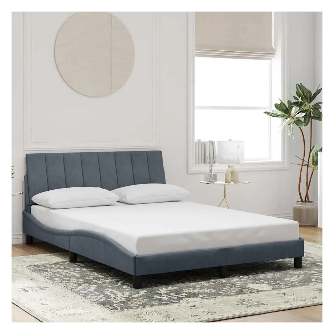 Obtenez une meilleure nuit de sommeil reposante grâce à ce cadre de lit avec tête de lit ! Il est un supplément accueillant à toute chambre à coucher. Velours doux : le velours est un tissu doux et confortable, agréable au toucher.Lattes de contreplaqué : les lattes de contreplaqué assurent une bonne répartition du poids, garantissant que le matelas reste en place à chaque torsion de votre corps pendant le sommeil.Excellent soutien : l'oreiller de tête de lit est rembourré avec de la mousse pour un confort ultra doux et optimal vous offre un excellent soutien du dos lorsque vous êtes assis dans votre lit pour lire ou regarder la télévision.Design pratique : le coussin de la tête de lit est doté d'une fermeture à glissière pour faciliter l'installation, et les bandes auto-agrippantes au dos peuvent être utilisées pour fixer les lampes LED.Design latéral ondulé : l’aspect ondulé du cadre de lit est élégant et sophistiqué, ajoutant une touche moderne et élégante à votre décor, ce qui en fait le point central de votre chambre à coucher. Bon à savoir :Un matelas n'est pas inclus avec ce lit. Nous offrons une sélection variée de matelas. Vous pouvez consulter notre boutique pour trouver un matelas assorti.