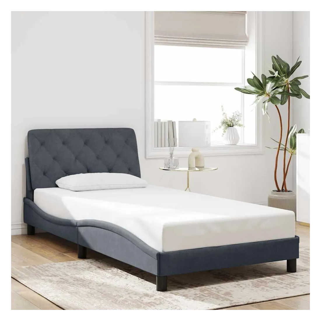 Obtenez une meilleure nuit de sommeil reposante grâce à ce cadre de lit avec tête de lit ! Il est un supplément accueillant à toute chambre à coucher. Velours doux : le velours est un tissu doux et confortable, agréable au toucher.Lattes de contreplaqué : les lattes de contreplaqué assurent une bonne répartition du poids, garantissant que le matelas reste en place à chaque torsion de votre corps pendant le sommeil.Excellent soutien : l'oreiller de tête de lit est rembourré avec de la fibre de polypropylène pour un confort ultra doux et optimal vous offre un excellent soutien du dos lorsque vous êtes assis dans votre lit pour lire ou regarder la télévision.Design latéral ondulé : l’aspect ondulé du cadre de lit est élégant et sophistiqué, ajoutant une touche moderne et élégante à votre décor, ce qui en fait le point central de votre chambre à coucher. Bon à savoir :Un matelas n'est pas inclus avec ce lit. Nous offrons une sélection variée de matelas. Vous pouvez consulter notre boutique pour trouver un matelas assorti.