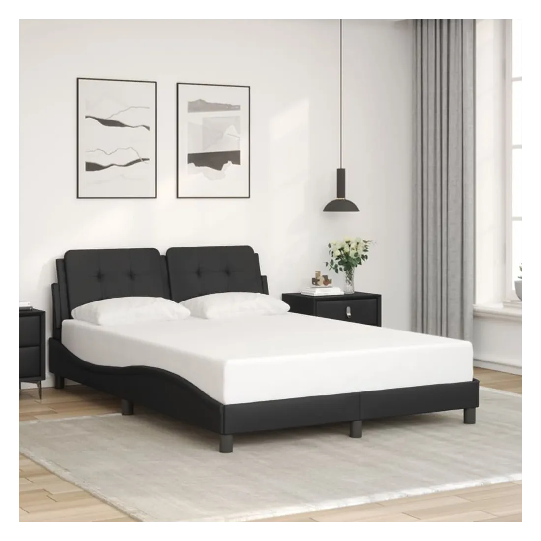 Obtenez une meilleure nuit de sommeil reposante grâce à ce cadre de lit avec tête de lit ! Il est un supplément accueillant à toute chambre à coucher. Similicuir durable : le similicuir de qualité supérieure est un matériau très durable. Il est résistant aux taches, ce qui le rend facile à nettoyer avec un chiffon humide. La surface lisse donne également un aspect luxueux et la beauté du cuir véritable.Lattes de contreplaqué : les lattes de contreplaqué assurent une bonne répartition du poids, garantissant que le matelas reste en place à chaque torsion de votre corps pendant le sommeil.Excellent soutien : l'oreiller de tête de lit est rembourré avec de la mousse pour un confort ultra doux et optimal vous offre un excellent soutien du dos lorsque vous êtes assis dans votre lit pour lire ou regarder la télévision.Design pratique : le coussin de tête de lit est doté d'une fermeture éclair pour une installation facile.Design latéral ondulé : l’aspect ondulé du cadre de lit est élégant et sophistiqué, ajoutant une touche moderne et élégante à votre décor, ce qui en fait le point central de votre chambre à coucher. Bon à savoir :Un matelas n'est pas inclus avec ce lit. Nous offrons une sélection variée de matelas. Vous pouvez consulter notre boutique pour trouver un matelas assorti.
