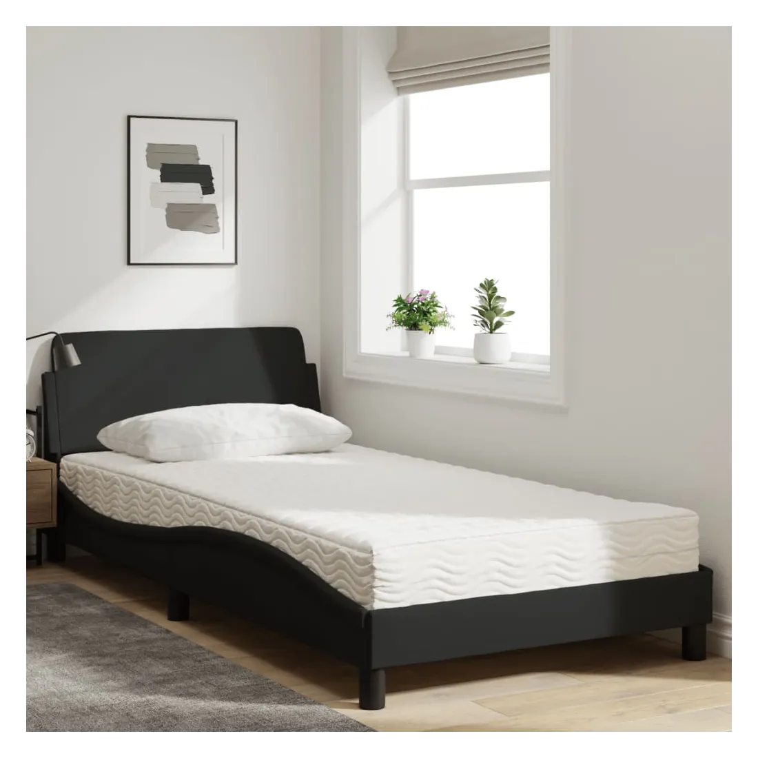 Obtenez une meilleure nuit de sommeil reposante grâce à ce lit avec matelas ! Il est un supplément accueillant à toute chambre à coucher. Tissu durable : le tissu présente un aspect simple et épuré, et il est respirant et durable.Lattes de contreplaqué : les lattes de contreplaqué assurent une bonne répartition du poids, garantissant que le matelas reste en place à chaque torsion de votre corps pendant le sommeil.Excellent soutien : la tête de lit vous offre un excellent soutien du dos lorsque vous êtes assis dans votre lit pour lire ou regarder la télévision.Matelas en mousse : ce matelas de lit en tissu à 3 couches est rempli de mousse PU 22D pour un confort optimal. Il contribue à soulager la fatigue et à favoriser la circulation sanguine, vous offrant ainsi une relaxation complète et une bonne qualité de sommeil. En outre, le matelas est disponible en dureté H2 et H3, de sorte que vous pouvez simplement tourner le matelas pour choisir la dureté qui vous convient le mieux.Design latéral ondulé : l’aspect ondulé du cadre de lit est élégant et sophistiqué, ajoutant une touche moderne et élégante à votre décor, ce qui en fait le point central de votre chambre à coucher.