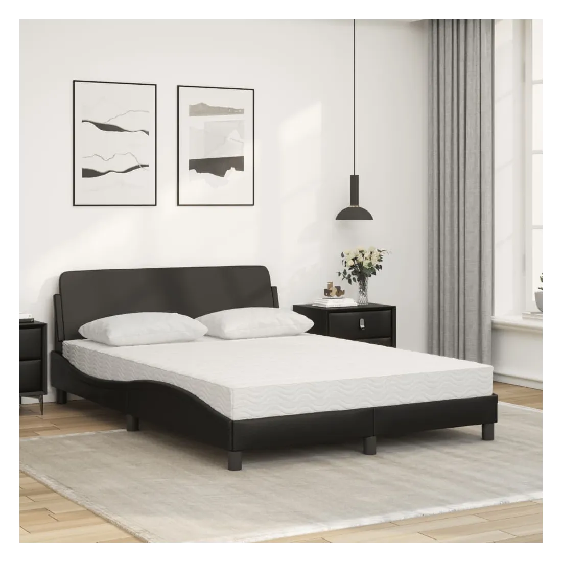 Obtenez une meilleure nuit de sommeil reposante grâce à ce lit avec matelas ! Il est un supplément accueillant à toute chambre à coucher. Similicuir durable : le similicuir de qualité supérieure est un matériau très durable. Il est résistant aux taches, ce qui le rend facile à nettoyer avec un chiffon humide. La surface lisse donne également un aspect luxueux et la beauté du cuir véritable.Lattes de contreplaqué : les lattes de contreplaqué assurent une bonne répartition du poids, garantissant que le matelas reste en place à chaque torsion de votre corps pendant le sommeil.Excellent soutien : la tête de lit vous offre un excellent soutien du dos lorsque vous êtes assis dans votre lit pour lire ou regarder la télévision.Matelas en mousse : ce matelas de lit en tissu à 3 couches est rempli de mousse PU 22D pour un confort optimal. Il contribue à soulager la fatigue et à favoriser la circulation sanguine, vous offrant ainsi une relaxation complète et une bonne qualité de sommeil. En outre, le matelas est disponible en dureté H2 et H3, de sorte que vous pouvez simplement tourner le matelas pour choisir la dureté qui vous convient le mieux.Design latéral ondulé : l’aspect ondulé du cadre de lit est élégant et sophistiqué, ajoutant une touche moderne et élégante à votre décor, ce qui en fait le point central de votre chambre à coucher.