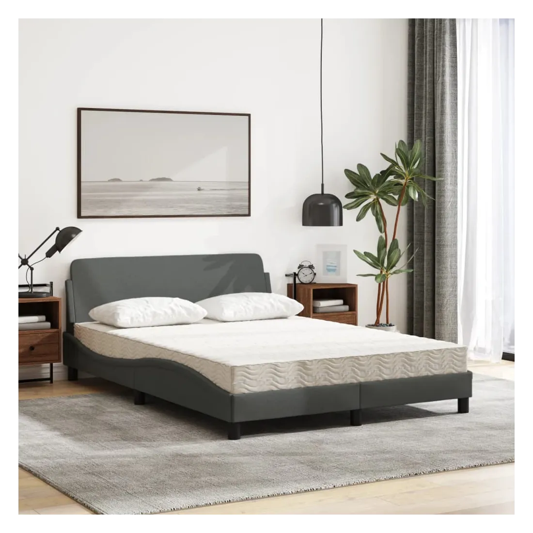 Obtenez une meilleure nuit de sommeil reposante grâce à ce lit avec matelas ! Il est un supplément accueillant à toute chambre à coucher. Tissu durable : le tissu présente un aspect simple et épuré, et il est respirant et durable.Lattes de contreplaqué : les lattes de contreplaqué assurent une bonne répartition du poids, garantissant que le matelas reste en place à chaque torsion de votre corps pendant le sommeil.Excellent soutien : la tête de lit vous offre un excellent soutien du dos lorsque vous êtes assis dans votre lit pour lire ou regarder la télévision.Matelas en mousse : ce matelas de lit en tissu à 3 couches est rempli de mousse PU 22D pour un confort optimal. Il contribue à soulager la fatigue et à favoriser la circulation sanguine, vous offrant ainsi une relaxation complète et une bonne qualité de sommeil. En outre, le matelas est disponible en dureté H2 et H3, de sorte que vous pouvez simplement tourner le matelas pour choisir la dureté qui vous convient le mieux.Design latéral ondulé : l’aspect ondulé du cadre de lit est élégant et sophistiqué, ajoutant une touche moderne et élégante à votre décor, ce qui en fait le point central de votre chambre à coucher.