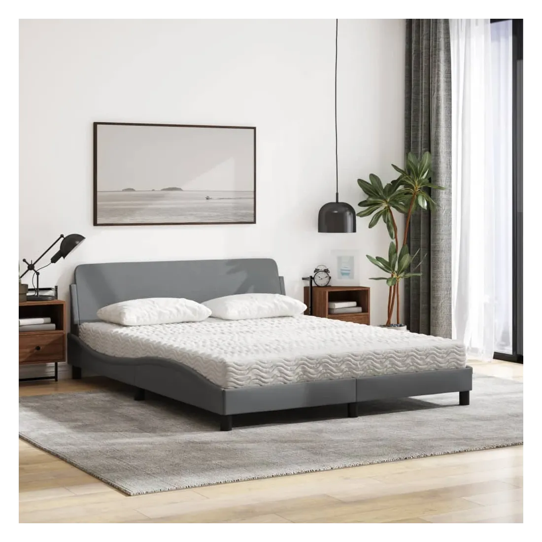 Obtenez une meilleure nuit de sommeil reposante grâce à ce lit avec matelas ! Il est un supplément accueillant à toute chambre à coucher. Tissu durable : le tissu présente un aspect simple et épuré, et il est respirant et durable.Lattes de contreplaqué : les lattes de contreplaqué assurent une bonne répartition du poids, garantissant que le matelas reste en place à chaque torsion de votre corps pendant le sommeil.Excellent soutien : la tête de lit vous offre un excellent soutien du dos lorsque vous êtes assis dans votre lit pour lire ou regarder la télévision.Matelas en mousse : ce matelas de lit en tissu à 3 couches est rempli de mousse PU 22D pour un confort optimal. Il contribue à soulager la fatigue et à favoriser la circulation sanguine, vous offrant ainsi une relaxation complète et une bonne qualité de sommeil. En outre, le matelas est disponible en dureté H2 et H3, de sorte que vous pouvez simplement tourner le matelas pour choisir la dureté qui vous convient le mieux.Design latéral ondulé : l’aspect ondulé du cadre de lit est élégant et sophistiqué, ajoutant une touche moderne et élégante à votre décor, ce qui en fait le point central de votre chambre à coucher.