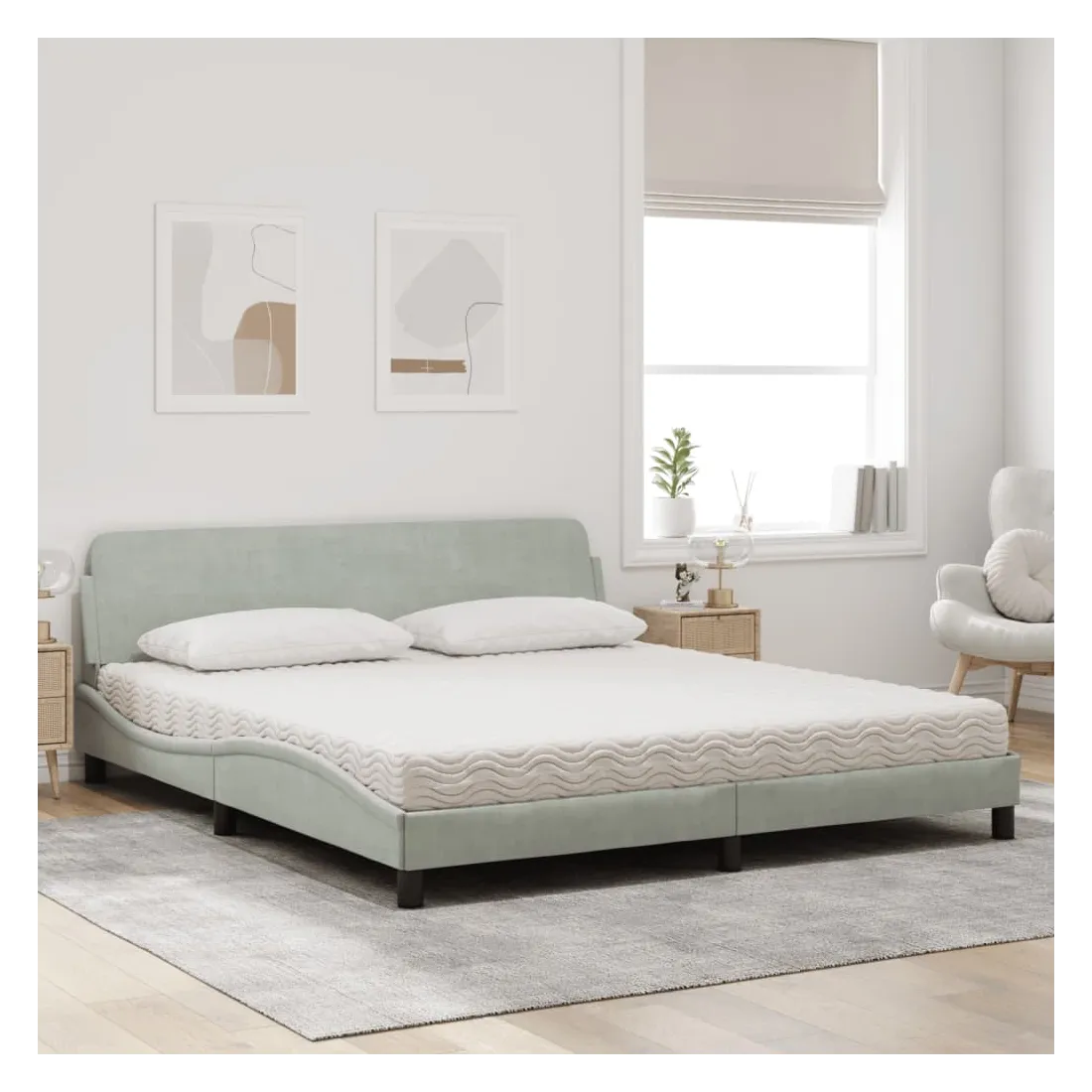 Obtenez une meilleure nuit de sommeil reposante grâce à ce lit avec matelas ! Il est un supplément accueillant à toute chambre à coucher. Velours doux : le velours est un tissu doux et confortable, agréable au toucher.Lattes de contreplaqué : les lattes de contreplaqué assurent une bonne répartition du poids, garantissant que le matelas reste en place à chaque torsion de votre corps pendant le sommeil.Excellent soutien : la tête de lit vous offre un excellent soutien du dos lorsque vous êtes assis dans votre lit pour lire ou regarder la télévision.Matelas en mousse : ce matelas de lit en tissu à 3 couches est rempli de mousse PU 22D pour un confort optimal. Il contribue à soulager la fatigue et à favoriser la circulation sanguine, vous offrant ainsi une relaxation complète et une bonne qualité de sommeil. En outre, le matelas est disponible en dureté H2 et H3, de sorte que vous pouvez simplement tourner le matelas pour choisir la dureté qui vous convient le mieux.Design latéral ondulé : l’aspect ondulé du cadre de lit est élégant et sophistiqué, ajoutant une touche moderne et élégante à votre décor, ce qui en fait le point central de votre chambre à coucher.