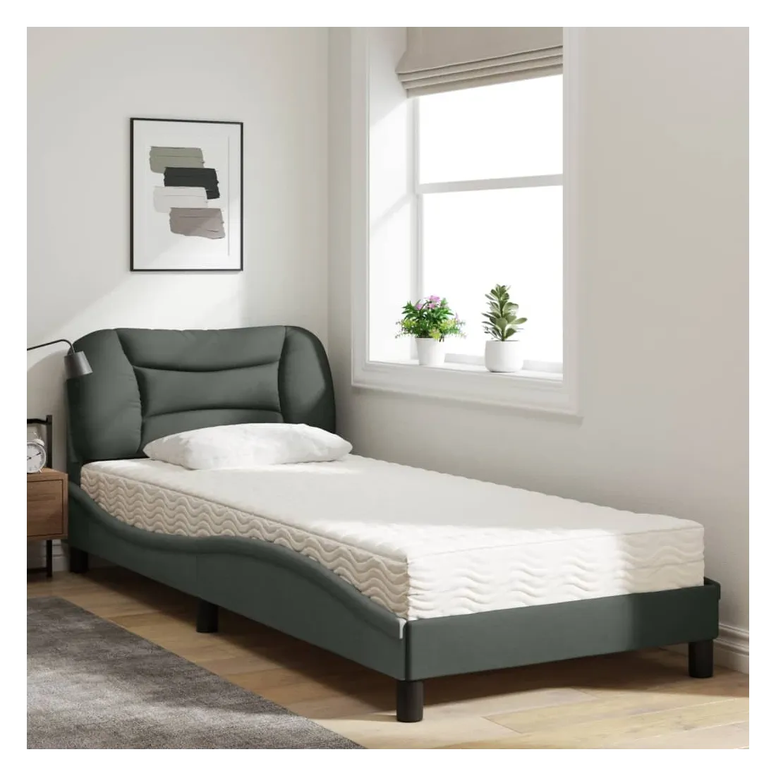 Obtenez une meilleure nuit de sommeil reposante grâce à ce lit avec matelas ! Il est un supplément accueillant à toute chambre à coucher. Tissu durable : le tissu présente un aspect simple et épuré, et il est respirant et durable.Lattes de contreplaqué : les lattes de contreplaqué assurent une bonne répartition du poids, garantissant que le matelas reste en place à chaque torsion de votre corps pendant le sommeil.Excellent soutien : la tête de lit vous offre un excellent soutien du dos lorsque vous êtes assis dans votre lit pour lire ou regarder la télévision.Matelas en mousse : ce matelas de lit en tissu à 3 couches est rempli de mousse PU 22D pour un confort optimal. Il contribue à soulager la fatigue et à favoriser la circulation sanguine, vous offrant ainsi une relaxation complète et une bonne qualité de sommeil. En outre, le matelas est disponible en dureté H2 et H3, de sorte que vous pouvez simplement tourner le matelas pour choisir la dureté qui vous convient le mieux.Design latéral ondulé : l’aspect ondulé du cadre de lit est élégant et sophistiqué, ajoutant une touche moderne et élégante à votre décor, ce qui en fait le point central de votre chambre à coucher.