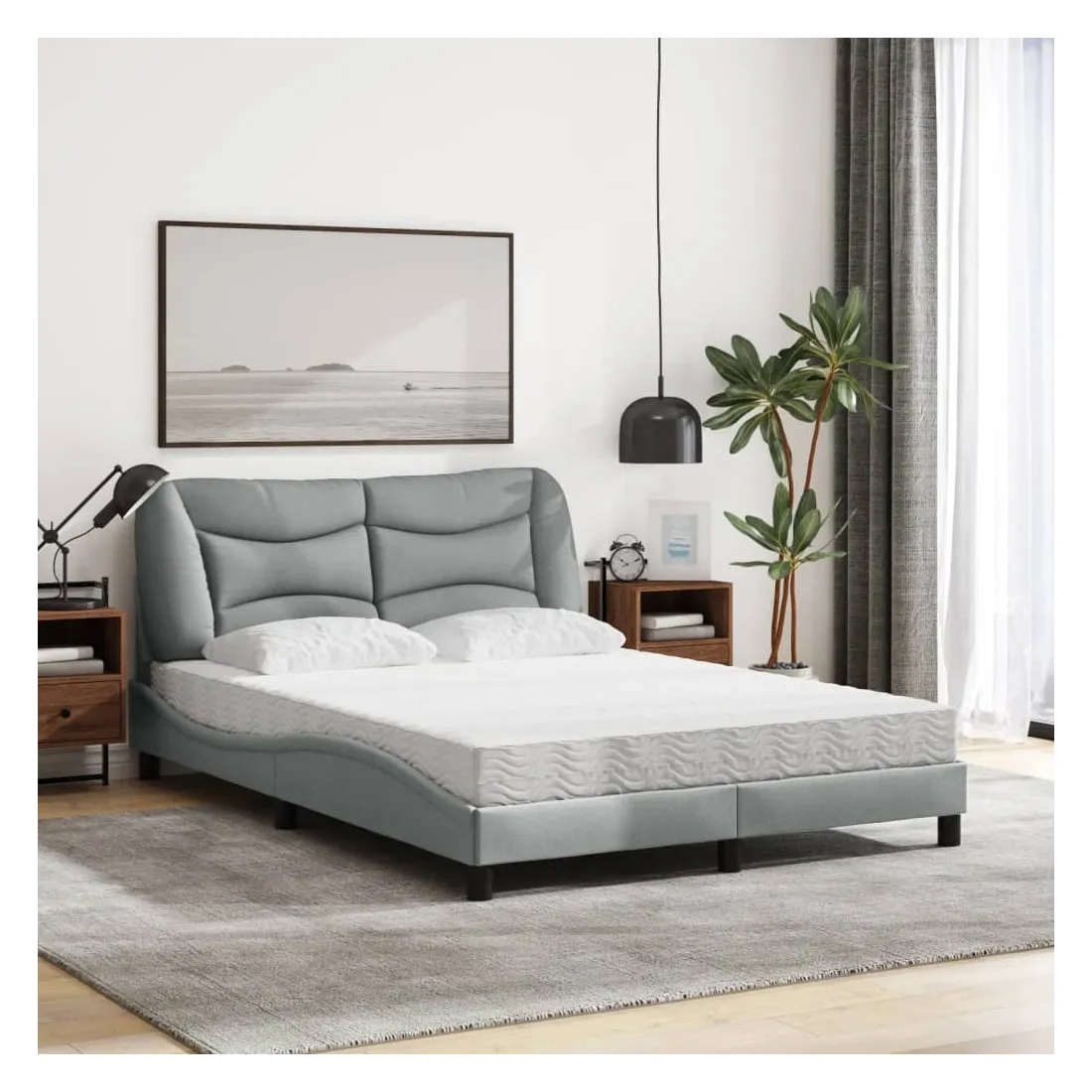 Obtenez une meilleure nuit de sommeil reposante grâce à ce lit avec matelas ! Il est un supplément accueillant à toute chambre à coucher. Tissu durable : le tissu présente un aspect simple et épuré, et il est respirant et durable.Lattes de contreplaqué : les lattes de contreplaqué assurent une bonne répartition du poids, garantissant que le matelas reste en place à chaque torsion de votre corps pendant le sommeil.Excellent soutien : la tête de lit vous offre un excellent soutien du dos lorsque vous êtes assis dans votre lit pour lire ou regarder la télévision.Matelas en mousse : ce matelas de lit en tissu à 3 couches est rempli de mousse PU 22D pour un confort optimal. Il contribue à soulager la fatigue et à favoriser la circulation sanguine, vous offrant ainsi une relaxation complète et une bonne qualité de sommeil. En outre, le matelas est disponible en dureté H2 et H3, de sorte que vous pouvez simplement tourner le matelas pour choisir la dureté qui vous convient le mieux.Design latéral ondulé : l’aspect ondulé du cadre de lit est élégant et sophistiqué, ajoutant une touche moderne et élégante à votre décor, ce qui en fait le point central de votre chambre à coucher.