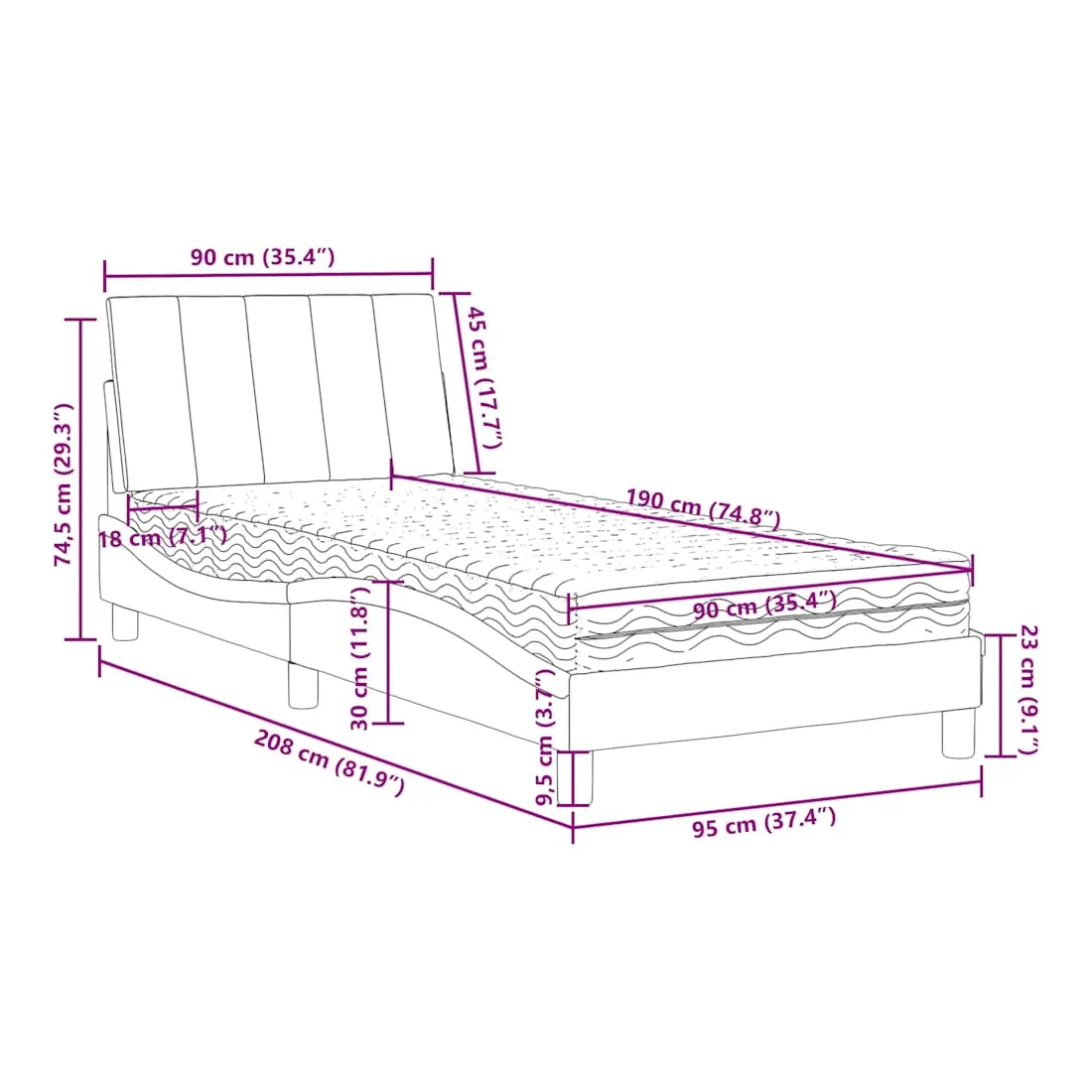 Obtenez une meilleure nuit de sommeil reposante grâce à ce lit avec matelas ! Il est un supplément accueillant à toute chambre à coucher. Velours doux : le velours est un tissu doux et confortable, agréable au toucher.Lattes de contreplaqué : les lattes de contreplaqué assurent une bonne répartition du poids, garantissant que le matelas reste en place à chaque torsion de votre corps pendant le sommeil.Excellent soutien : la tête de lit vous offre un excellent soutien du dos lorsque vous êtes assis dans votre lit pour lire ou regarder la télévision.Matelas en mousse : ce matelas de lit en tissu à 3 couches est rempli de mousse PU 22D pour un confort optimal. Il contribue à soulager la fatigue et à favoriser la circulation sanguine, vous offrant ainsi une relaxation complète et une bonne qualité de sommeil. En outre, le matelas est disponible en dureté H2 et H3, de sorte que vous pouvez simplement tourner le matelas pour choisir la dureté qui vous convient le mieux.Design latéral ondulé : l’aspect ondulé du cadre de lit est élégant et sophistiqué, ajoutant une touche moderne et élégante à votre décor, ce qui en fait le point central de votre chambre à coucher.