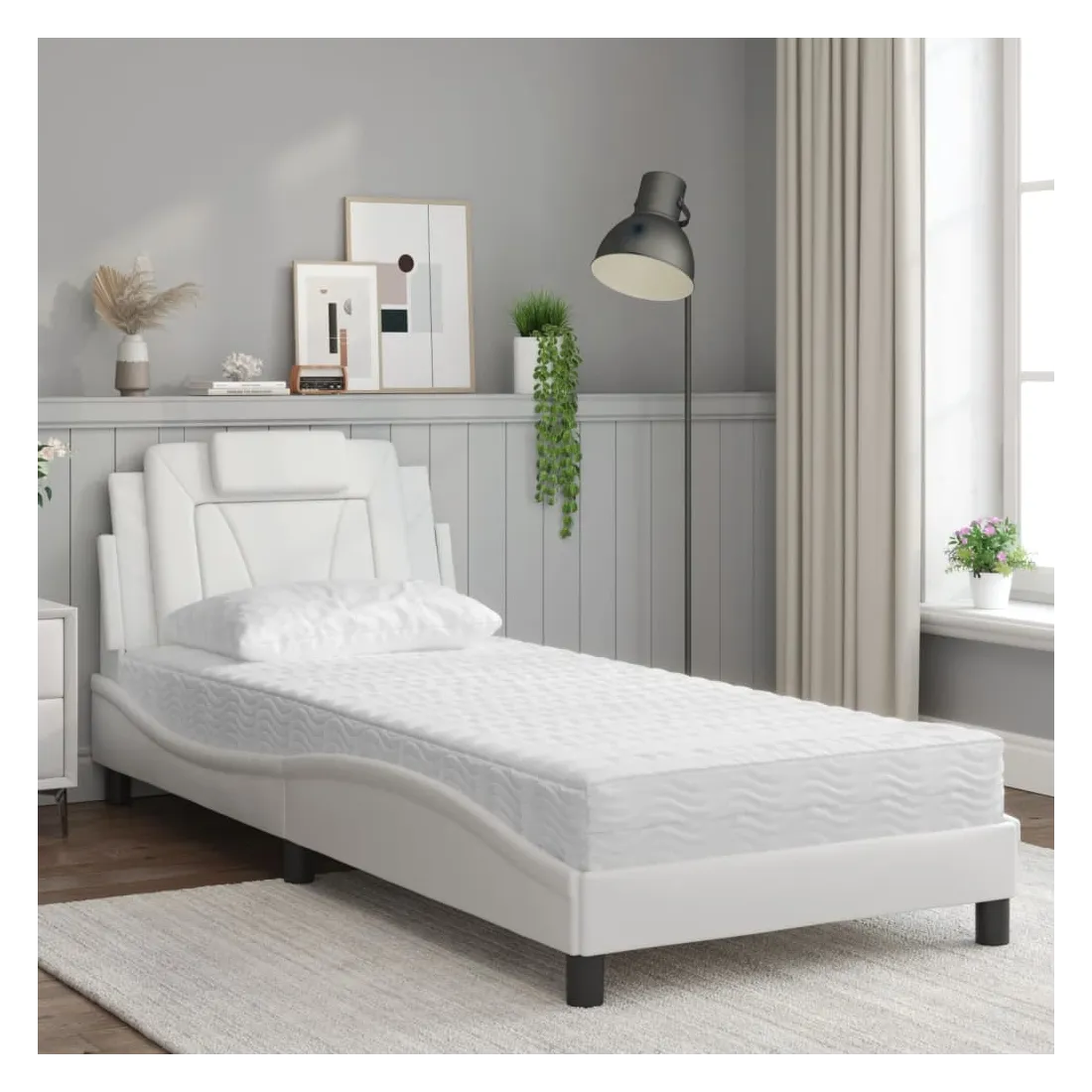 Obtenez une meilleure nuit de sommeil reposante grâce à ce lit avec matelas ! Il est un supplément accueillant à toute chambre à coucher. Similicuir durable : le similicuir de qualité supérieure est un matériau très durable. Il est résistant aux taches, ce qui le rend facile à nettoyer avec un chiffon humide. La surface lisse donne également un aspect luxueux et la beauté du cuir véritable. Lattes de contreplaqué : les lattes de contreplaqué assurent une bonne répartition du poids, garantissant que le matelas reste en place à chaque torsion de votre corps pendant le sommeil. Excellent soutien : l'oreiller de tête de lit est rembourré avec de la mousse pour un confort ultra doux et optimal vous offre un excellent soutien du dos lorsque vous êtes assis dans votre lit pour lire ou regarder la télévision. Matelas en mousse : ce matelas de lit en tissu à 3 couches est rempli de mousse PU 22D pour un confort optimal. Il contribue à soulager la fatigue et à favoriser la circulation sanguine, vous offrant ainsi une relaxation complète et une bonne qualité de sommeil. En outre, le matelas est disponible en dureté H2 et H3, de sorte que vous pouvez simplement tourner le matelas pour choisir la dureté qui vous convient le mieux. Design latéral ondulé : l’aspect ondulé du cadre de lit est élégant et sophistiqué, ajoutant une touche moderne et élégante à votre décor, ce qui en fait le point central de votre chambre à coucher.
