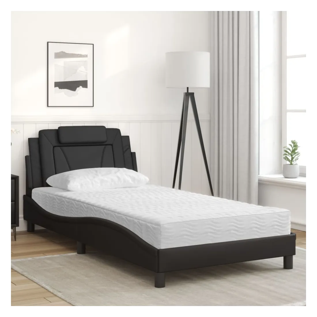 Obtenez une meilleure nuit de sommeil reposante grâce à ce lit avec matelas ! Il est un supplément accueillant à toute chambre à coucher. Similicuir durable : le similicuir de qualité supérieure est un matériau très durable. Il est résistant aux taches, ce qui le rend facile à nettoyer avec un chiffon humide. La surface lisse donne également un aspect luxueux et la beauté du cuir véritable. Lattes de contreplaqué : les lattes de contreplaqué assurent une bonne répartition du poids, garantissant que le matelas reste en place à chaque torsion de votre corps pendant le sommeil. Excellent soutien : l'oreiller de tête de lit est rembourré avec de la mousse pour un confort ultra doux et optimal vous offre un excellent soutien du dos lorsque vous êtes assis dans votre lit pour lire ou regarder la télévision. Matelas en mousse : ce matelas de lit en tissu à 3 couches est rempli de mousse PU 22D pour un confort optimal. Il contribue à soulager la fatigue et à favoriser la circulation sanguine, vous offrant ainsi une relaxation complète et une bonne qualité de sommeil. En outre, le matelas est disponible en dureté H2 et H3, de sorte que vous pouvez simplement tourner le matelas pour choisir la dureté qui vous convient le mieux. Design latéral ondulé : l’aspect ondulé du cadre de lit est élégant et sophistiqué, ajoutant une touche moderne et élégante à votre décor, ce qui en fait le point central de votre chambre à coucher.