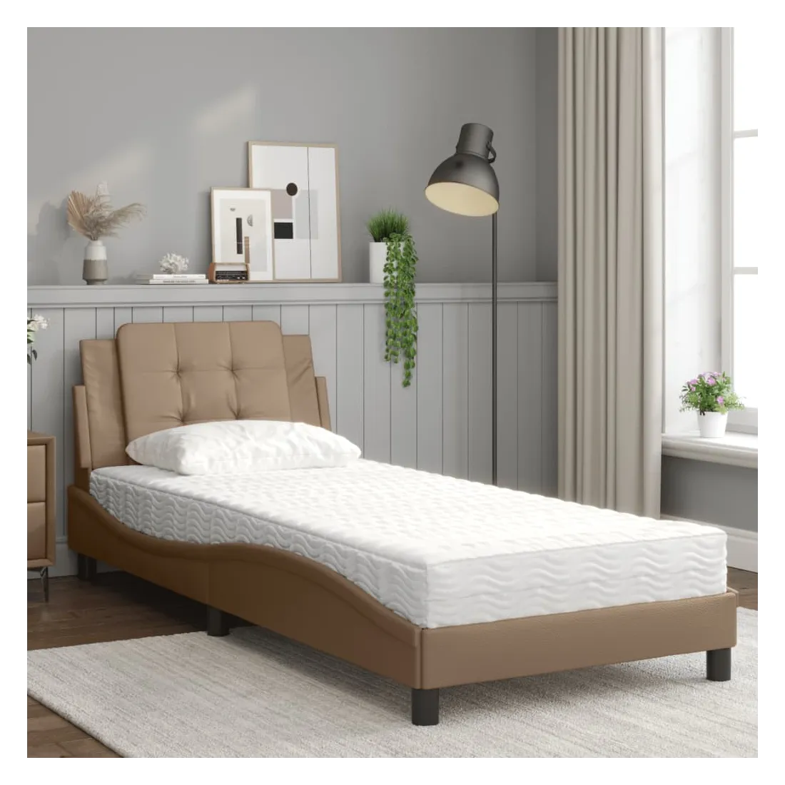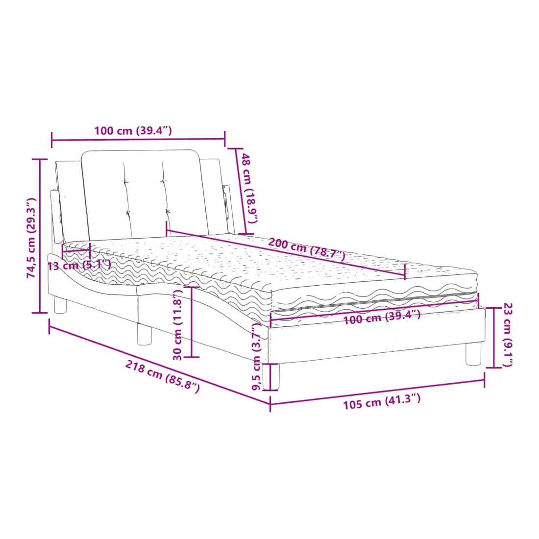 Obtenez une meilleure nuit de sommeil reposante grâce à ce lit avec matelas ! Il est un supplément accueillant à toute chambre à coucher. Similicuir durable : le similicuir de qualité supérieure est un matériau très durable. Il est résistant aux taches, ce qui le rend facile à nettoyer avec un chiffon humide. La surface lisse donne également un aspect luxueux et la beauté du cuir véritable. Lattes de contreplaqué : les lattes de contreplaqué assurent une bonne répartition du poids, garantissant que le matelas reste en place à chaque torsion de votre corps pendant le sommeil. Excellent soutien : l'oreiller de tête de lit est rembourré avec de la mousse pour un confort ultra doux et optimal vous offre un excellent soutien du dos lorsque vous êtes assis dans votre lit pour lire ou regarder la télévision. Matelas en mousse : ce matelas de lit en tissu à 3 couches est rempli de mousse PU 22D pour un confort optimal. Il contribue à soulager la fatigue et à favoriser la circulation sanguine, vous offrant ainsi une relaxation complète et une bonne qualité de sommeil. En outre, le matelas est disponible en dureté H2 et H3, de sorte que vous pouvez simplement tourner le matelas pour choisir la dureté qui vous convient le mieux. Design latéral ondulé : l’aspect ondulé du cadre de lit est élégant et sophistiqué, ajoutant une touche moderne et élégante à votre décor, ce qui en fait le point central de votre chambre à coucher.