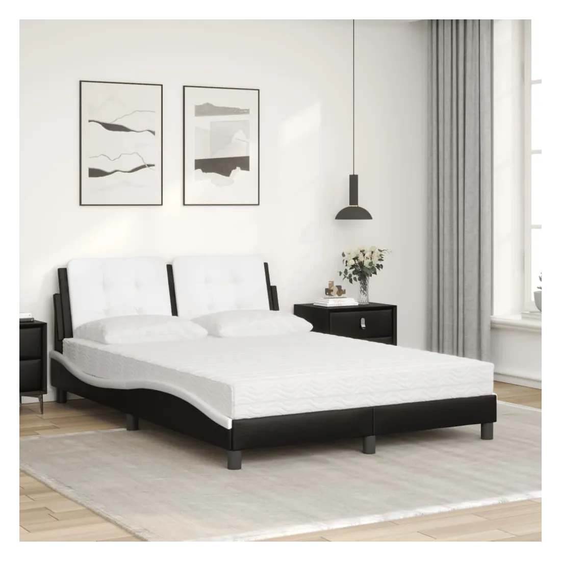 Obtenez une meilleure nuit de sommeil reposante grâce à ce lit avec matelas ! Il est un supplément accueillant à toute chambre à coucher. Similicuir durable : le similicuir de qualité supérieure est un matériau très durable. Il est résistant aux taches, ce qui le rend facile à nettoyer avec un chiffon humide. La surface lisse donne également un aspect luxueux et la beauté du cuir véritable. Lattes de contreplaqué : les lattes de contreplaqué assurent une bonne répartition du poids, garantissant que le matelas reste en place à chaque torsion de votre corps pendant le sommeil. Excellent soutien : l'oreiller de tête de lit est rembourré avec de la mousse pour un confort ultra doux et optimal vous offre un excellent soutien du dos lorsque vous êtes assis dans votre lit pour lire ou regarder la télévision. Matelas en mousse : ce matelas de lit en tissu à 3 couches est rempli de mousse PU 22D pour un confort optimal. Il contribue à soulager la fatigue et à favoriser la circulation sanguine, vous offrant ainsi une relaxation complète et une bonne qualité de sommeil. En outre, le matelas est disponible en dureté H2 et H3, de sorte que vous pouvez simplement tourner le matelas pour choisir la dureté qui vous convient le mieux. Design latéral ondulé : l’aspect ondulé du cadre de lit est élégant et sophistiqué, ajoutant une touche moderne et élégante à votre décor, ce qui en fait le point central de votre chambre à coucher.