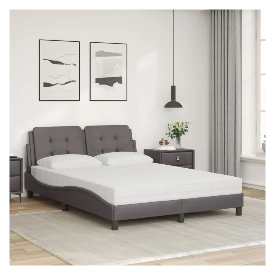Obtenez une meilleure nuit de sommeil reposante grâce à ce lit avec matelas ! Il est un supplément accueillant à toute chambre à coucher. Similicuir durable : le similicuir de qualité supérieure est un matériau très durable. Il est résistant aux taches, ce qui le rend facile à nettoyer avec un chiffon humide. La surface lisse donne également un aspect luxueux et la beauté du cuir véritable. Lattes de contreplaqué : les lattes de contreplaqué assurent une bonne répartition du poids, garantissant que le matelas reste en place à chaque torsion de votre corps pendant le sommeil. Excellent soutien : l'oreiller de tête de lit est rembourré avec de la mousse pour un confort ultra doux et optimal vous offre un excellent soutien du dos lorsque vous êtes assis dans votre lit pour lire ou regarder la télévision. Matelas en mousse : ce matelas de lit en tissu à 3 couches est rempli de mousse PU 22D pour un confort optimal. Il contribue à soulager la fatigue et à favoriser la circulation sanguine, vous offrant ainsi une relaxation complète et une bonne qualité de sommeil. En outre, le matelas est disponible en dureté H2 et H3, de sorte que vous pouvez simplement tourner le matelas pour choisir la dureté qui vous convient le mieux. Design latéral ondulé : l’aspect ondulé du cadre de lit est élégant et sophistiqué, ajoutant une touche moderne et élégante à votre décor, ce qui en fait le point central de votre chambre à coucher.