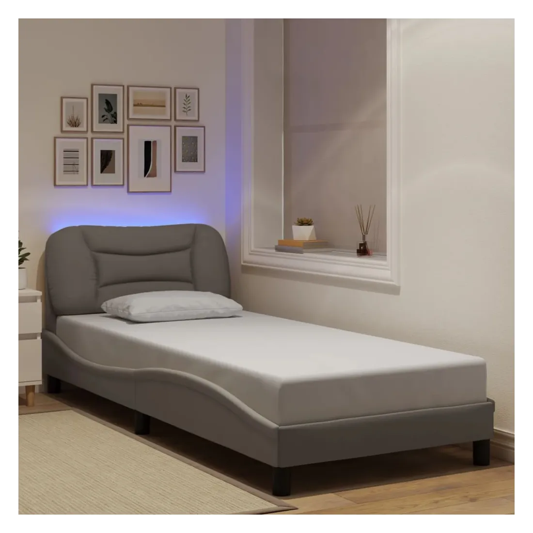 vidaXLObtenez une meilleure nuit de sommeil reposante grâce à ce cadre de lit avec lumières LED ! Il est un supplément accueillant à toute chambre à coucher. Tissu durable : le tissu présente un aspect simple et épuré, et il est respirant et durable.Lattes de contreplaqué : les lattes de contreplaqué assurent une bonne répartition du poids, garantissant que le matelas reste en place à chaque torsion de votre corps pendant le sommeil.Excellent soutien : la tête de lit vous offre un excellent soutien du dos lorsque vous êtes assis dans votre lit pour lire ou regarder la télévision.Bande LED colorée : apportez de la gaieté dans l'obscurité avec des lumières LED colorées ! Les bandes auto-agrippantes situées à l'arrière du coussin de la tête de lit peuvent être utilisées pour fixer les lumières LED.Design latéral ondulé : l’aspect ondulé du cadre de lit est élégant et sophistiqué, ajoutant une touche moderne et élégante à votre décor, ce qui en fait le point central de votre chambre à coucher. Bon à savoir :Un matelas n'est pas inclus avec ce lit. Nous offrons une sélection variée de matelas. Vous pouvez consulter notre boutique pour trouver un matelas assorti.Ce produit est doté d'un connecteur USB qui nécessite une source d'alimentation USB de 5V certifiée (non incluse).