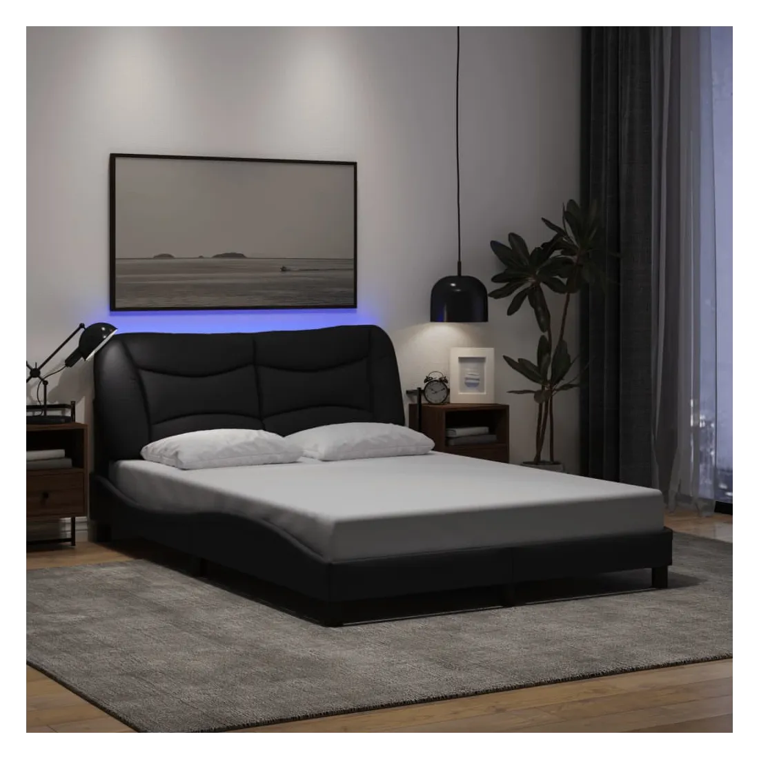Obtenez une meilleure nuit de sommeil reposante grâce à ce cadre de lit avec lumières LED ! Il est un supplément accueillant à toute chambre à coucher. Tissu durable : le tissu présente un aspect simple et épuré, et il est respirant et durable.Lattes de contreplaqué : les lattes de contreplaqué assurent une bonne répartition du poids, garantissant que le matelas reste en place à chaque torsion de votre corps pendant le sommeil.Excellent soutien : la tête de lit vous offre un excellent soutien du dos lorsque vous êtes assis dans votre lit pour lire ou regarder la télévision.Bande LED colorée : apportez de la gaieté dans l'obscurité avec des lumières LED colorées ! Les bandes auto-agrippantes situées à l'arrière du coussin de la tête de lit peuvent être utilisées pour fixer les lumières LED.Design latéral ondulé : l’aspect ondulé du cadre de lit est élégant et sophistiqué, ajoutant une touche moderne et élégante à votre décor, ce qui en fait le point central de votre chambre à coucher. Bon à savoir :Un matelas n'est pas inclus avec ce lit. Nous offrons une sélection variée de matelas. Vous pouvez consulter notre boutique pour trouver un matelas assorti.Ce produit est doté d'un connecteur USB qui nécessite une source d'alimentation USB de 5V certifiée (non incluse).