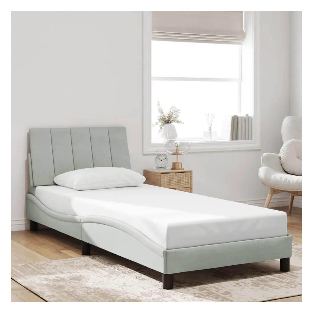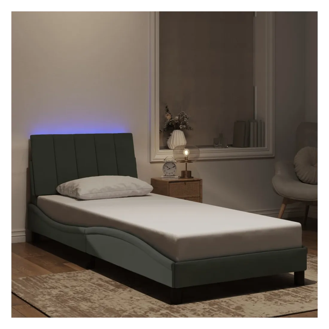 Obtenez une meilleure nuit de sommeil reposante grâce à ce cadre de lit avec lumières LED ! Il est un supplément accueillant à toute chambre à coucher. Velours doux : le velours est un tissu doux et confortable, agréable au toucher.Lattes de contreplaqué : les lattes de contreplaqué assurent une bonne répartition du poids, garantissant que le matelas reste en place à chaque torsion de votre corps pendant le sommeil.Excellent soutien : la tête de lit vous offre un excellent soutien du dos lorsque vous êtes assis dans votre lit pour lire ou regarder la télévision.Bande LED colorée : apportez de la gaieté dans l'obscurité avec des lumières LED colorées ! Les bandes auto-agrippantes situées à l'arrière du coussin de la tête de lit peuvent être utilisées pour fixer les lumières LED.Design latéral ondulé : l’aspect ondulé du cadre de lit est élégant et sophistiqué, ajoutant une touche moderne et élégante à votre décor, ce qui en fait le point central de votre chambre à coucher. Bon à savoir :Un matelas n'est pas inclus avec ce lit. Nous offrons une sélection variée de matelas. Vous pouvez consulter notre boutique pour trouver un matelas assorti.Ce produit est doté d'un connecteur USB qui nécessite une source d'alimentation USB de 5V certifiée (non incluse).