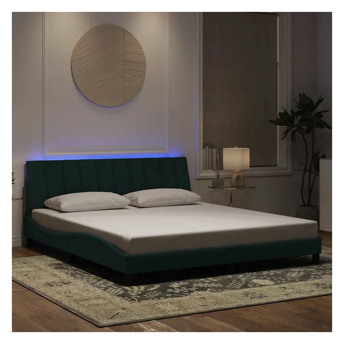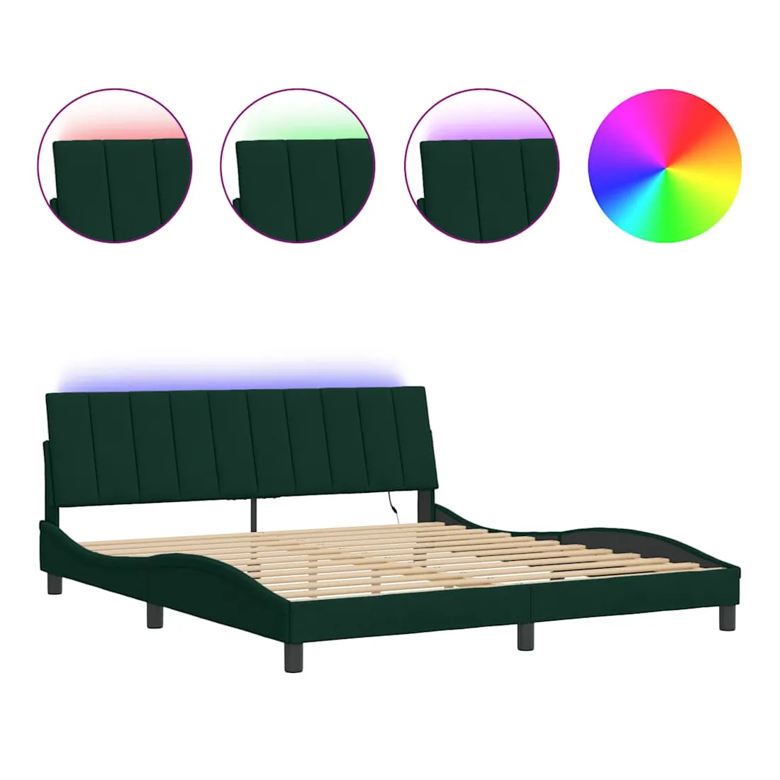 vidaXLObtenez une meilleure nuit de sommeil reposante grâce à ce cadre de lit avec lumières LED ! Il est un supplément accueillant à toute chambre à coucher. Velours doux : le velours est un tissu doux et confortable, agréable au toucher.Lattes de contreplaqué : les lattes de contreplaqué assurent une bonne répartition du poids, garantissant que le matelas reste en place à chaque torsion de votre corps pendant le sommeil.Excellent soutien : la tête de lit vous offre un excellent soutien du dos lorsque vous êtes assis dans votre lit pour lire ou regarder la télévision.Bande LED colorée : apportez de la gaieté dans l'obscurité avec des lumières LED colorées ! Les bandes auto-agrippantes situées à l'arrière du coussin de la tête de lit peuvent être utilisées pour fixer les lumières LED.Design latéral ondulé : l’aspect ondulé du cadre de lit est élégant et sophistiqué, ajoutant une touche moderne et élégante à votre décor, ce qui en fait le point central de votre chambre à coucher. Bon à savoir :Un matelas n'est pas inclus avec ce lit. Nous offrons une sélection variée de matelas. Vous pouvez consulter notre boutique pour trouver un matelas assorti.Ce produit est doté d'un connecteur USB qui nécessite une source d'alimentation USB de 5V certifiée (non incluse).